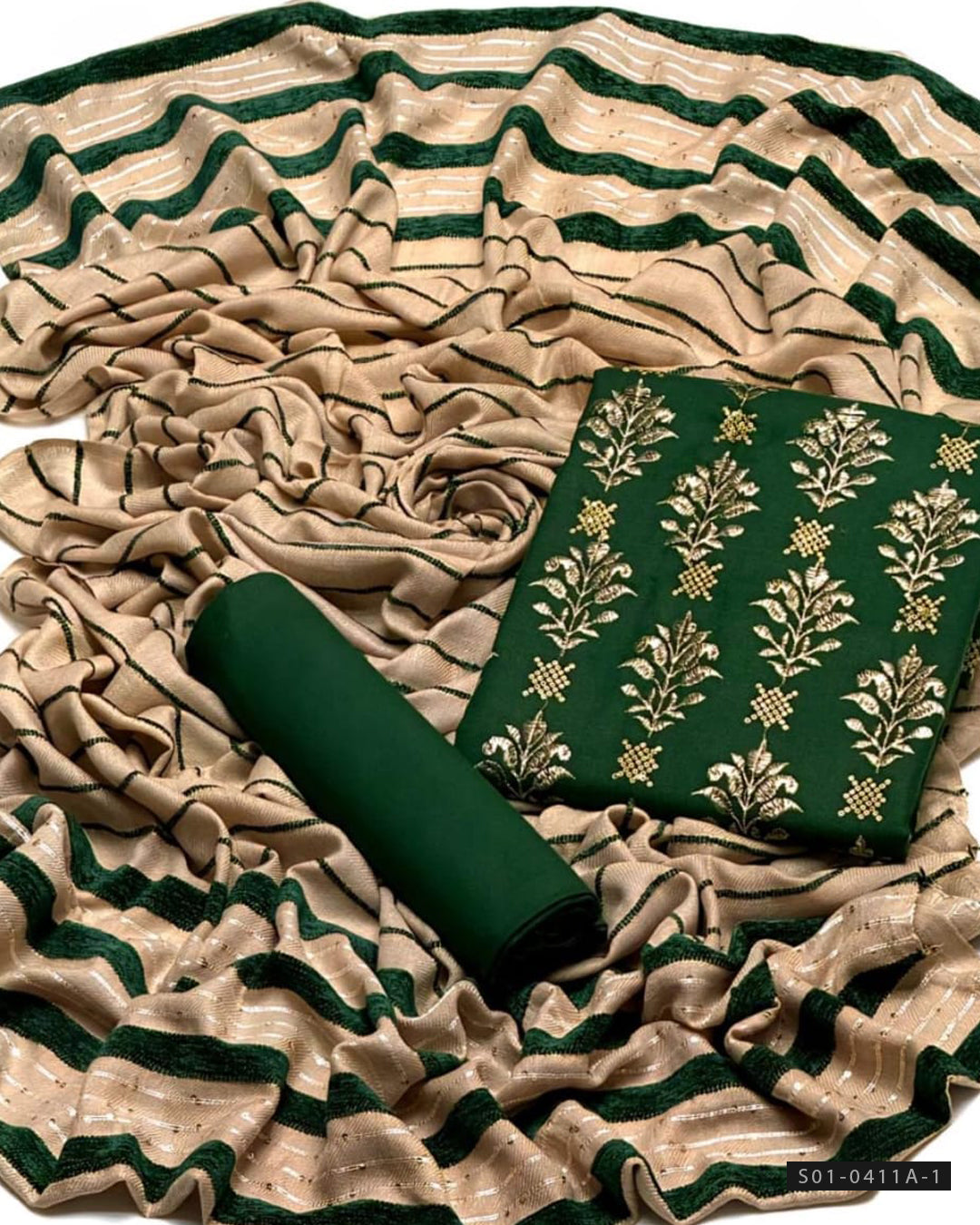 Fabric Detail:-Bareeza Dhanak Shirt with embroidery + Matching embroidered Dhanak Trouser + Pashmina wool shawl with velvet border