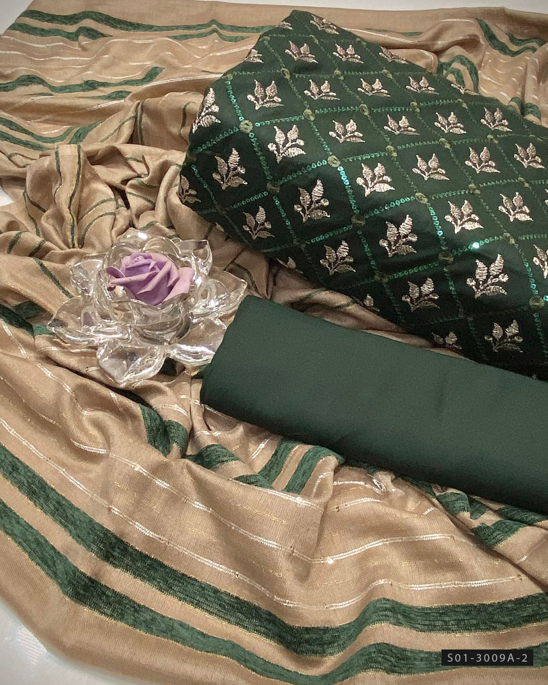 Fabric Detail:-Sequins Work Embroidered Marina Linen Shirt + Plain Marina Trouser + Acrylic Wool Shawl with Velvet Border