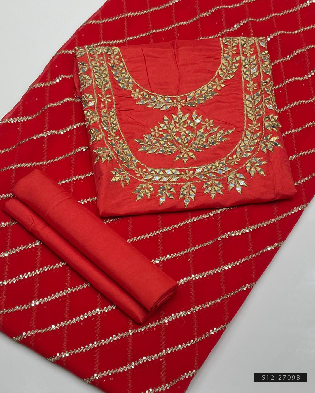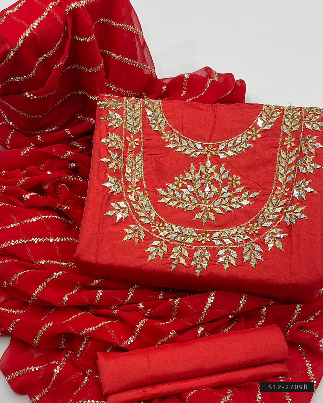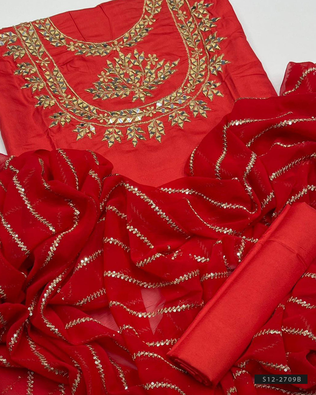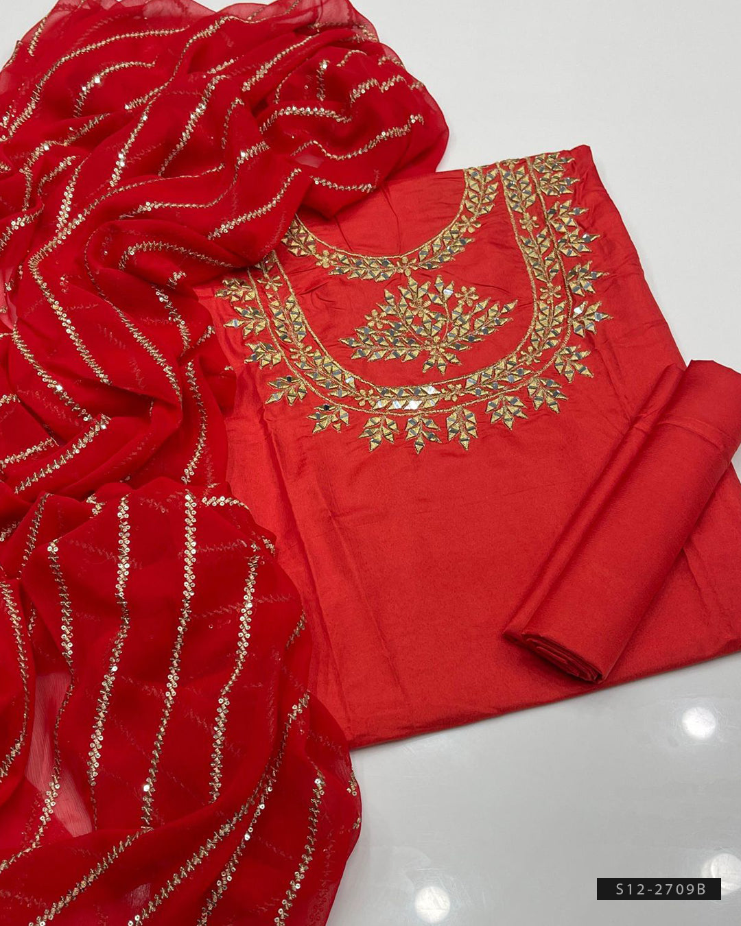 Fabric Detail:- Katan Silk Mirror Work Shirt + Chiffon Sequins Embroidered Dupatta + Plain Katan Silk Trouser + Katan Silk & Chiffon – Best for Formal & Party Wear...