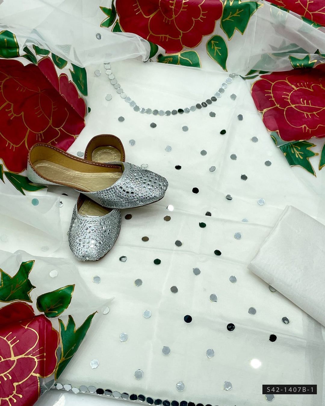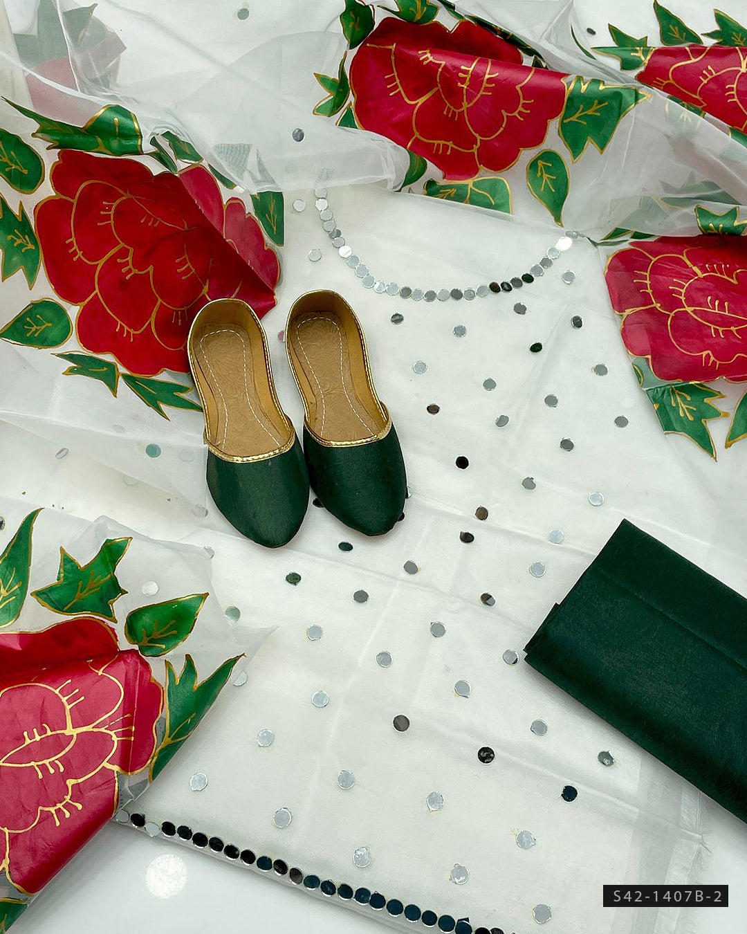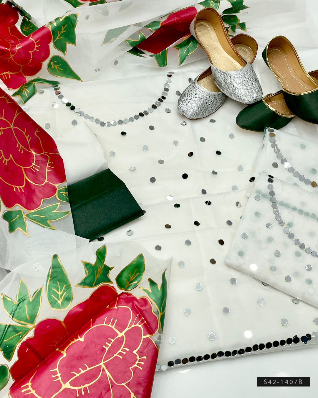 π 14.14 Independence Day Sale πFabric Detail:- Mirror Work Embroidered Organza ShirtHand Painted Organza DupattaPlain Katan Silk TrouserKhussa Gift Bilkul Free 14 August par khud ko...