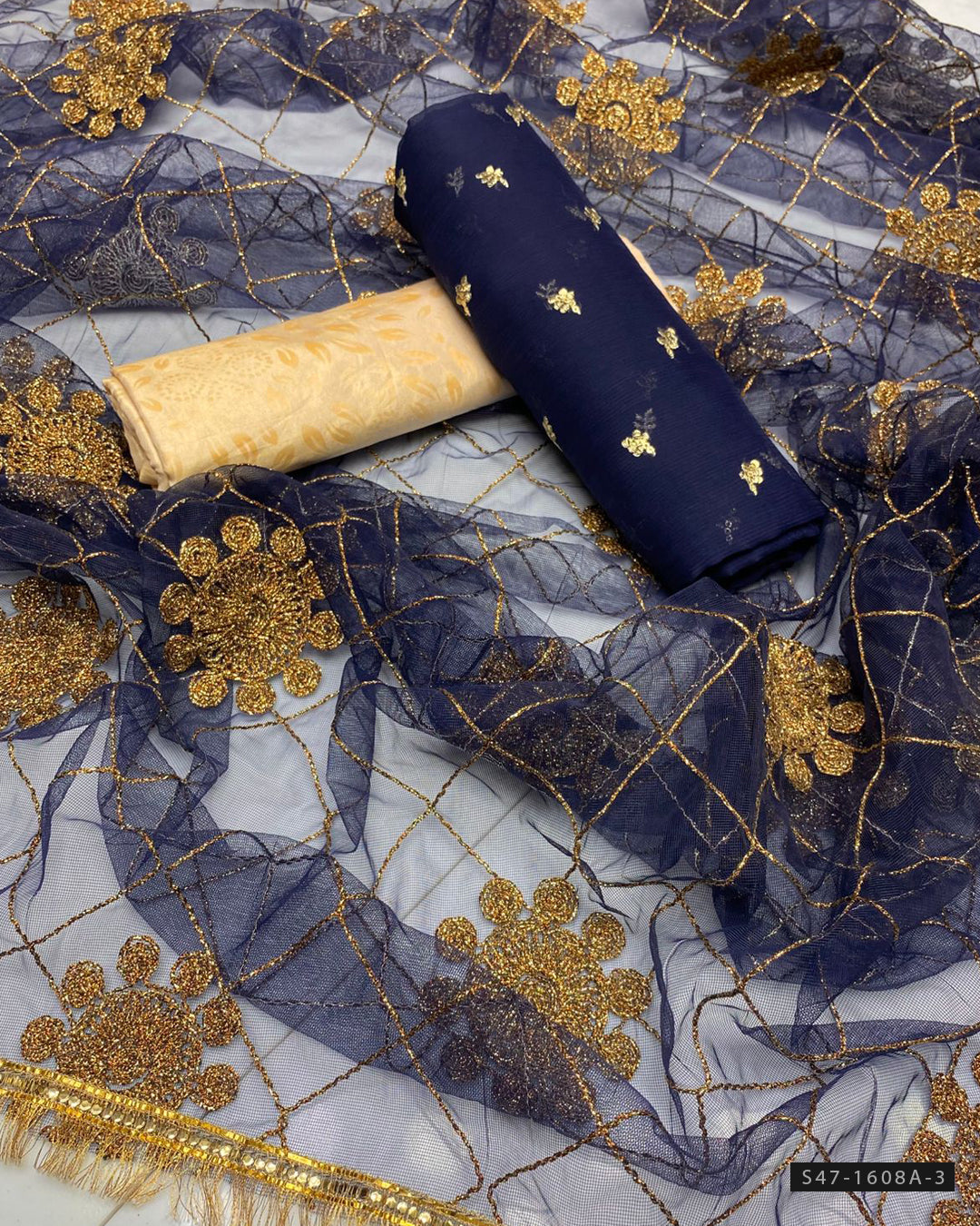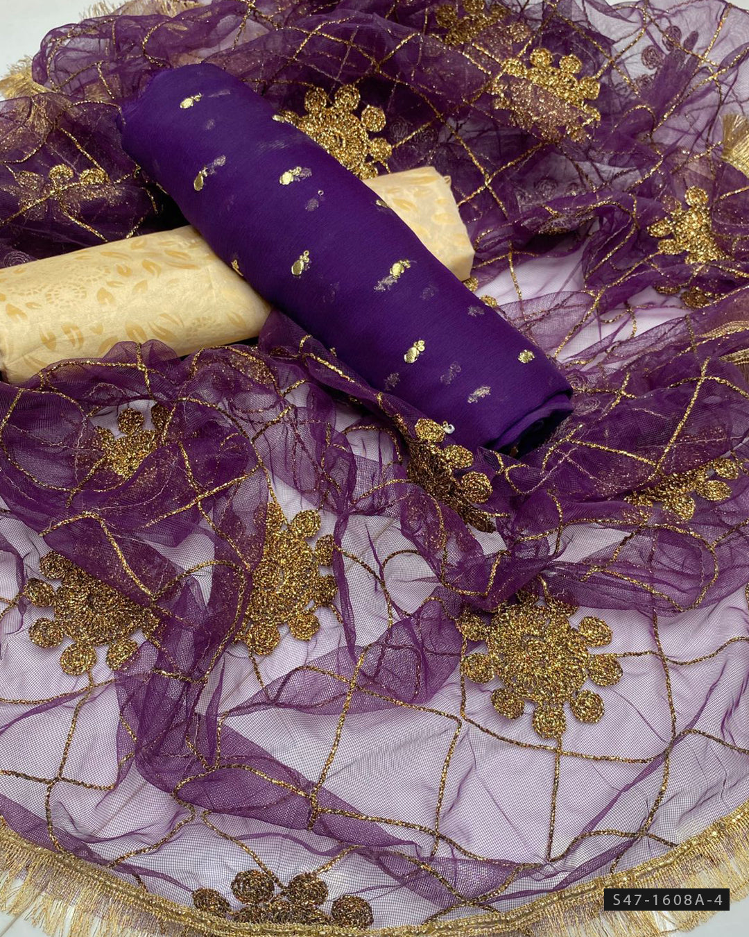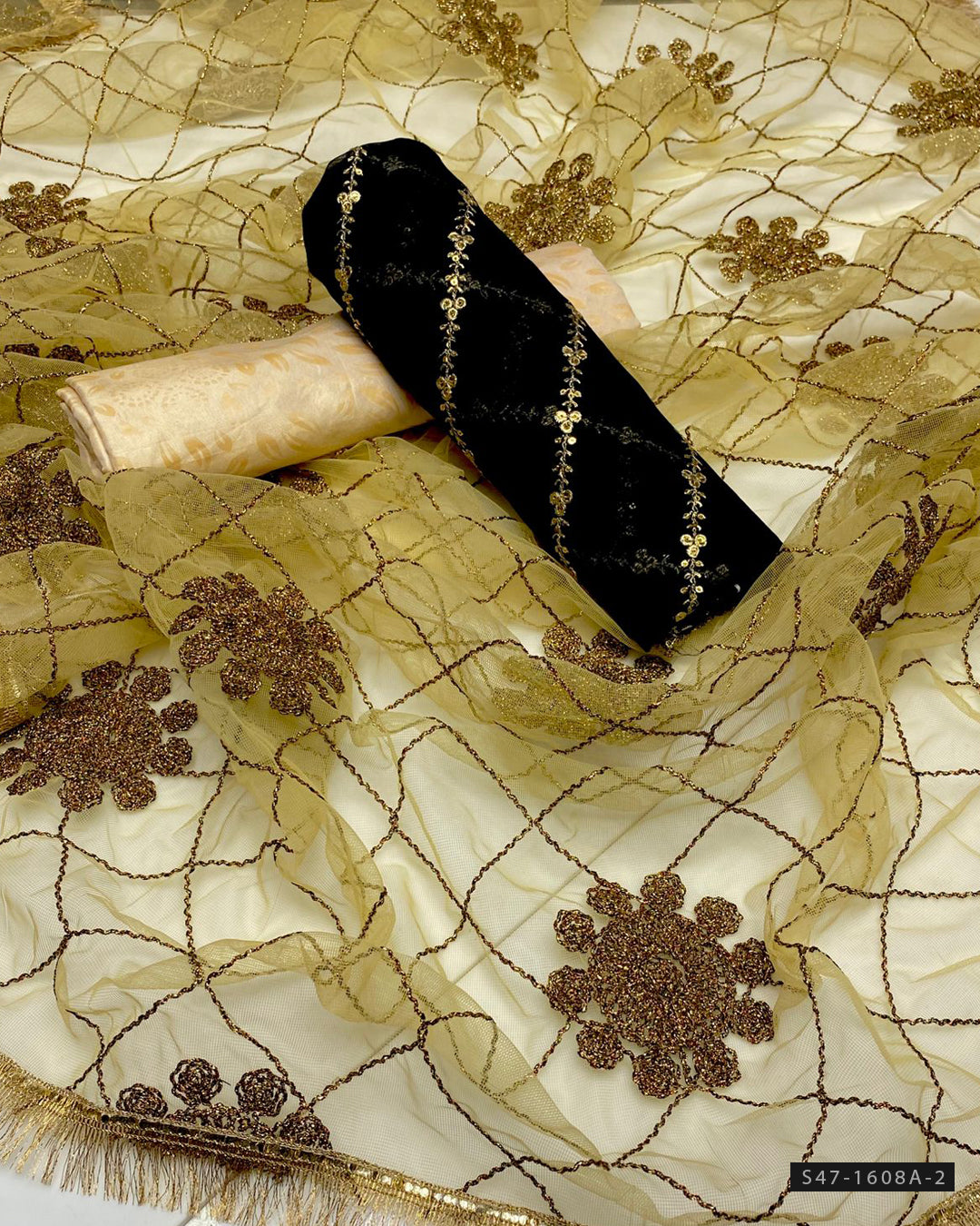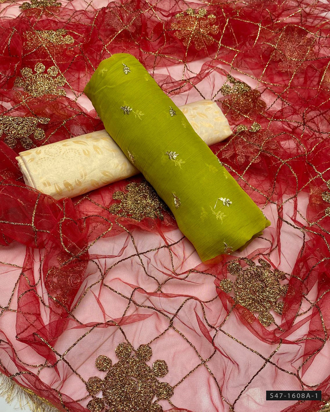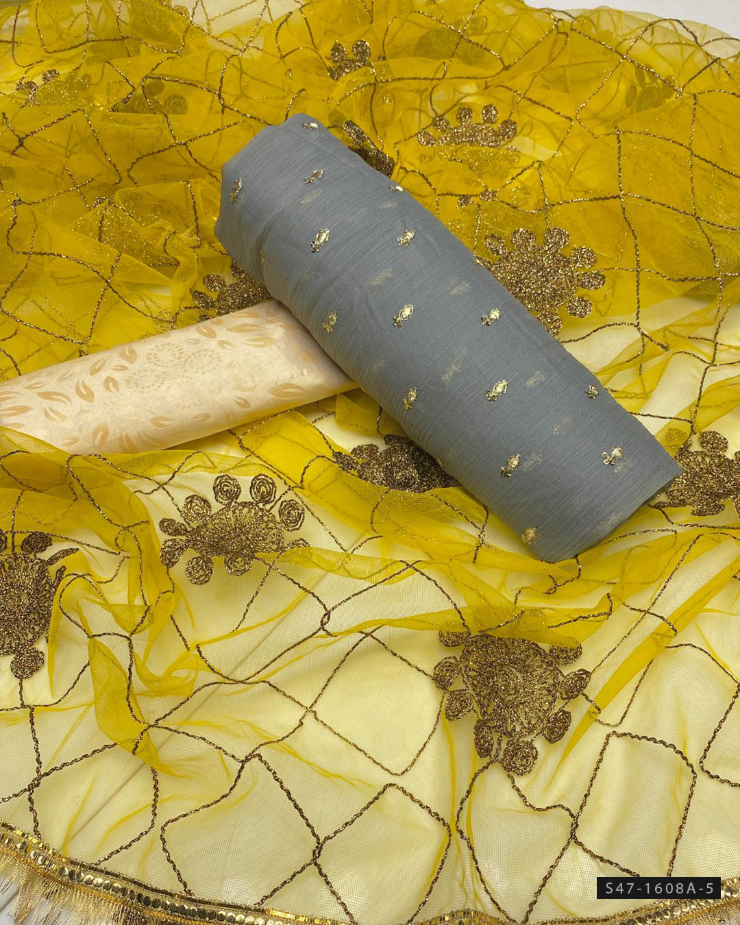 Boti embroidered crinkle chiffon shirtNet gotta work embroidered dupattaPlain masouri trouser