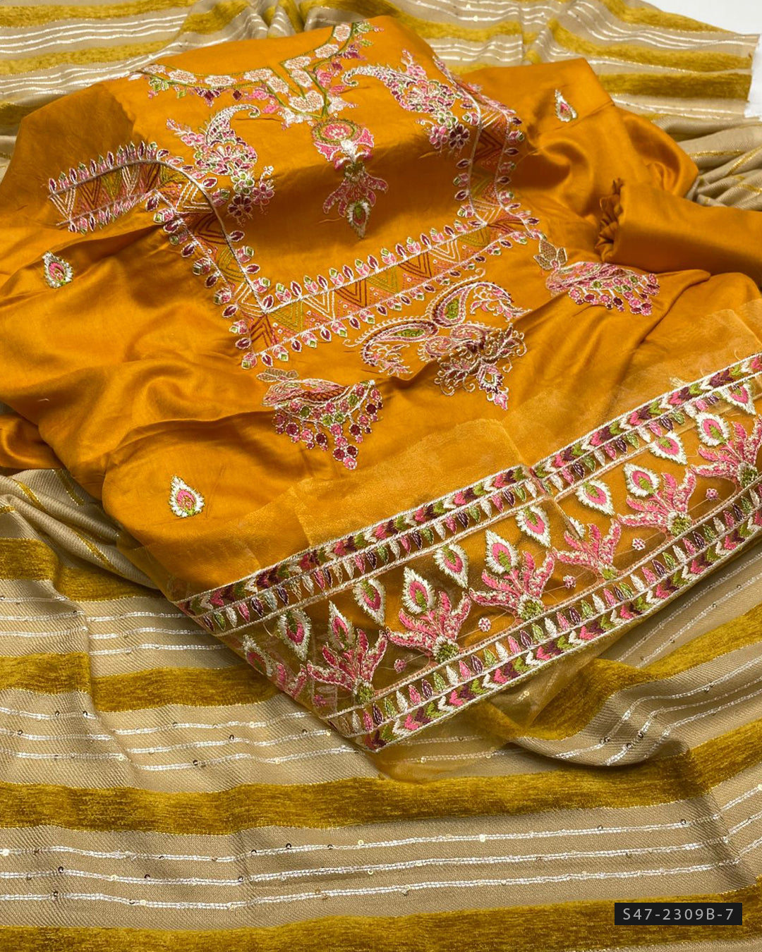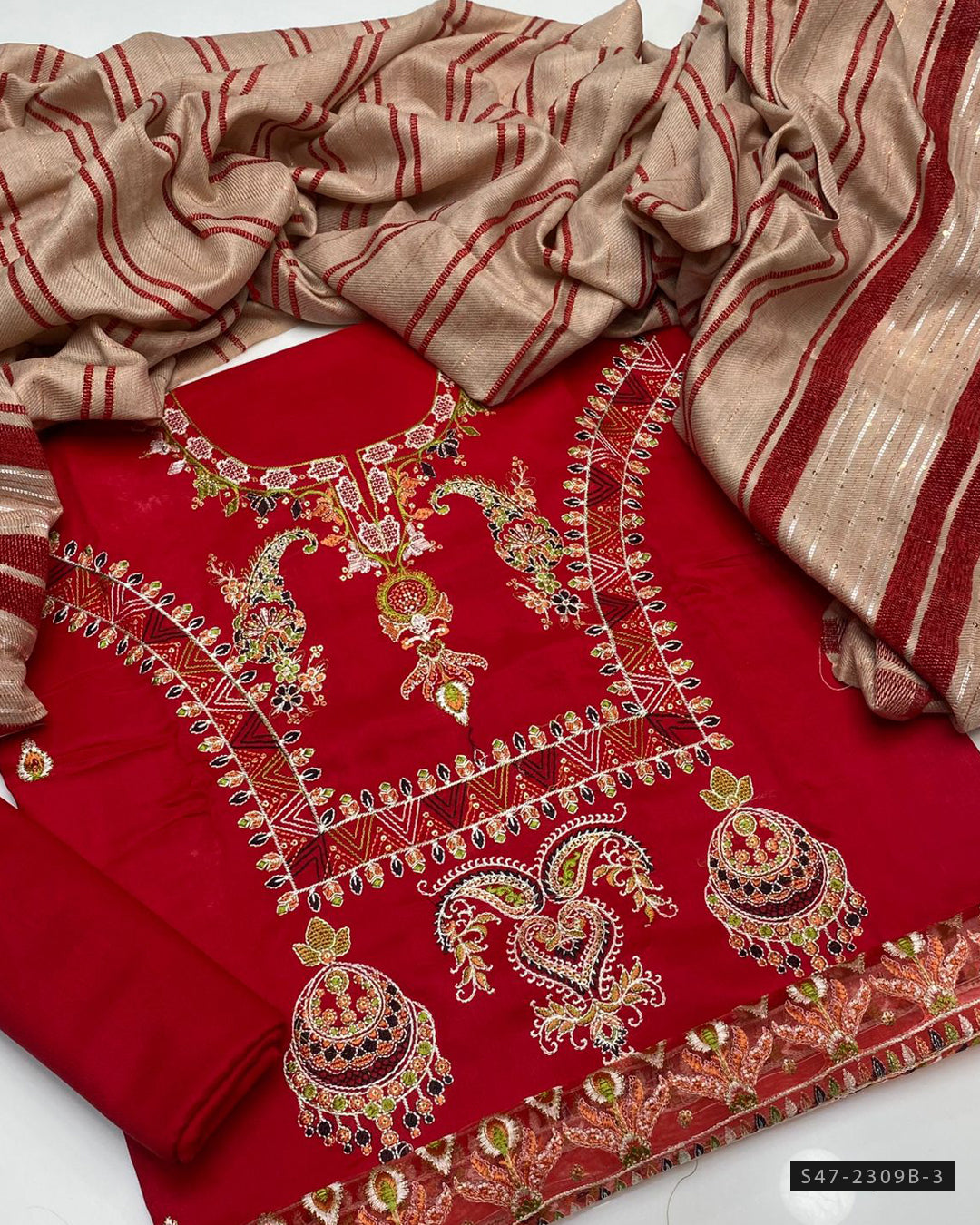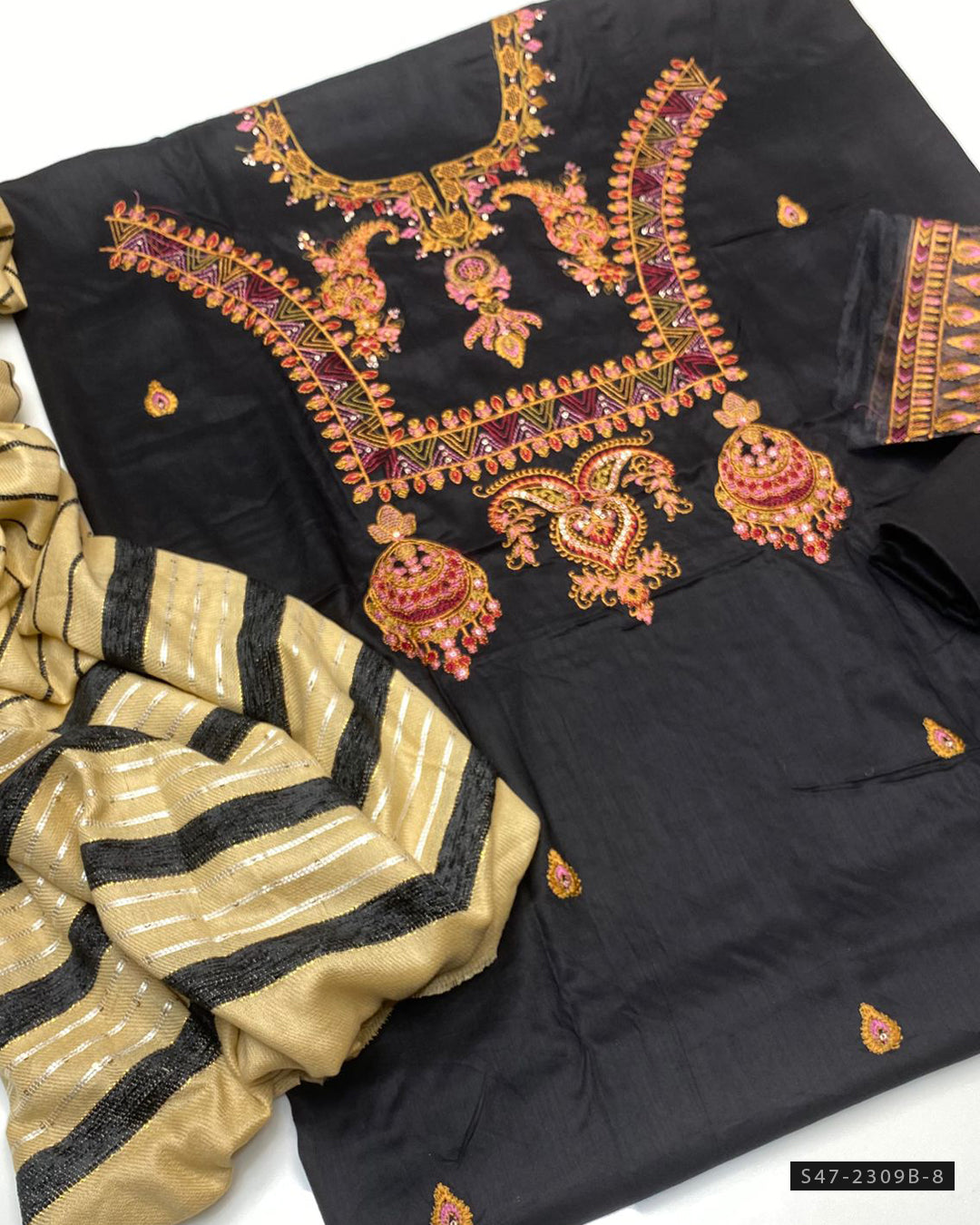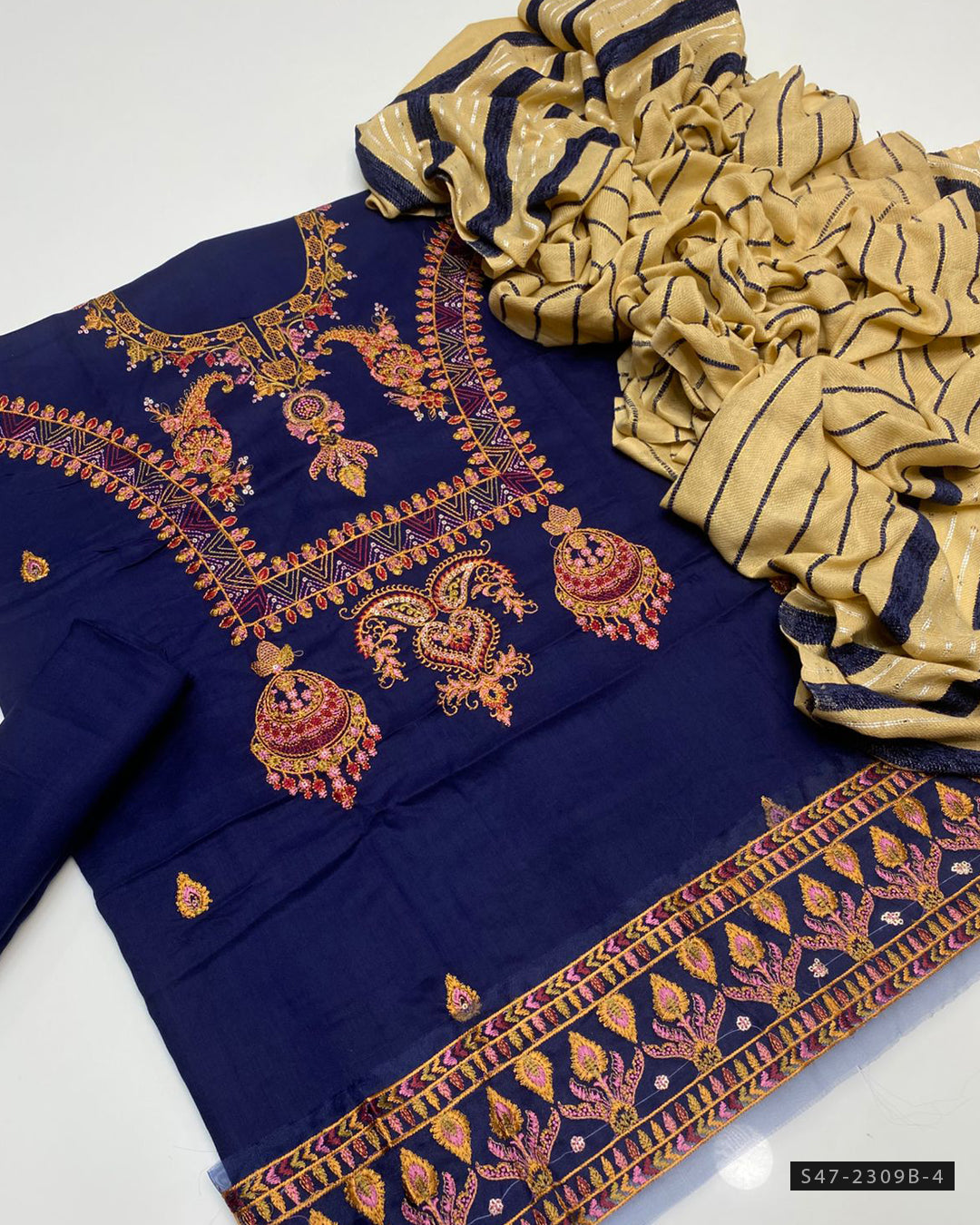 Fabric Detail:-Marina Linen Shirt with Embroidered Patch + Lining Velvet Work Shawl with Border Design + Plain Marina Trouser