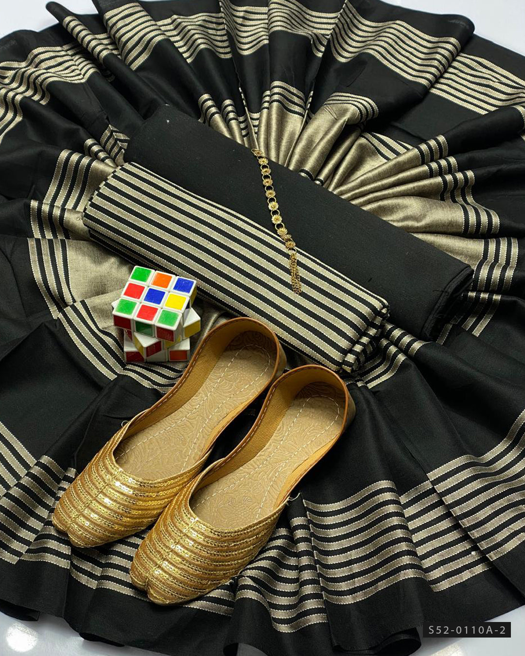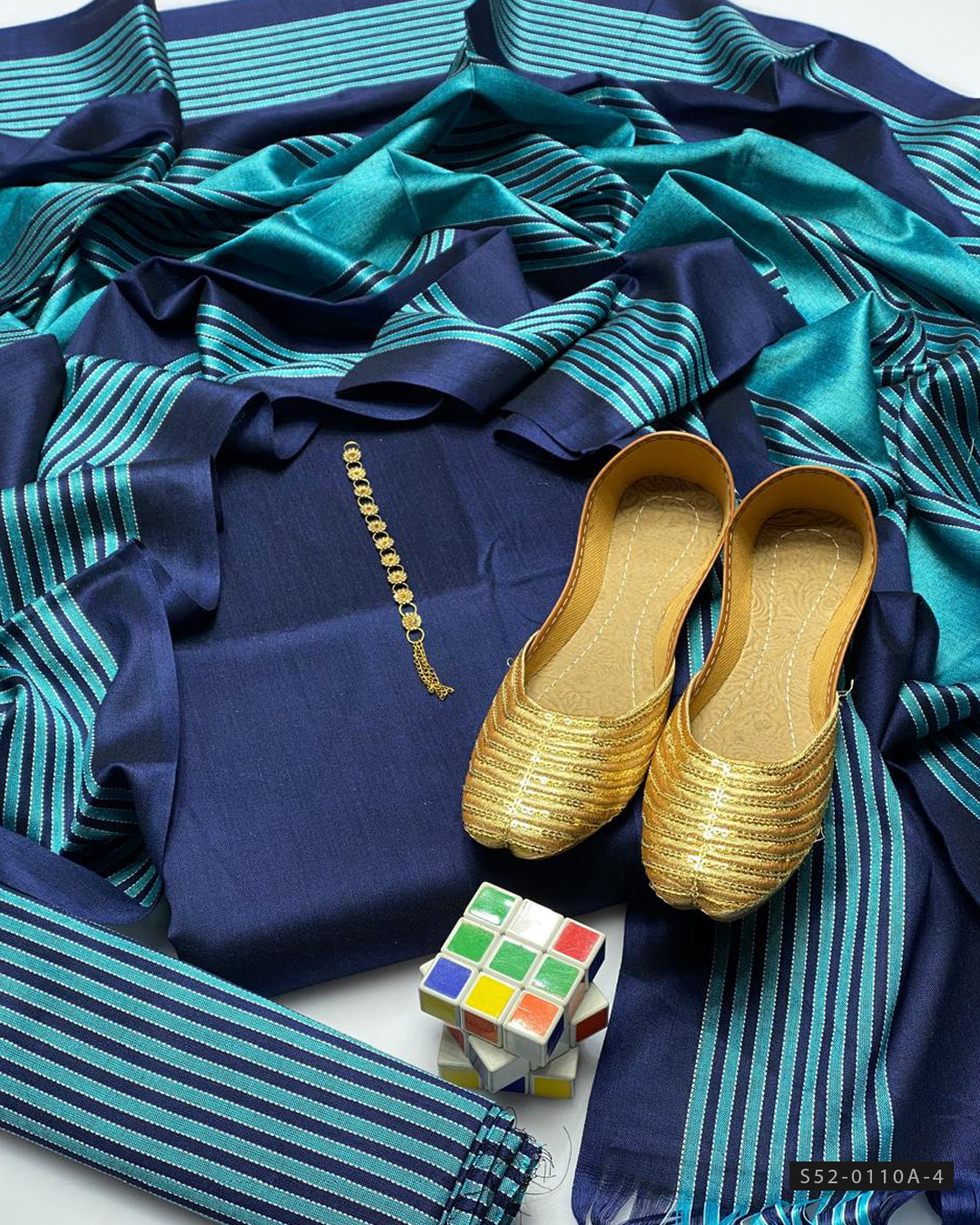 Fabric Detail:-Banarsi Susi Plain Shirt (Without Neckline) + Jacquard Banarsi Marina Shawl + Susi Banarsi Marina Trouser + With Beautiful Khussa