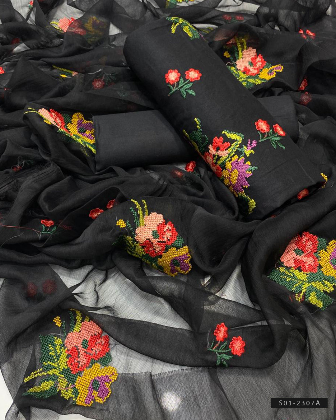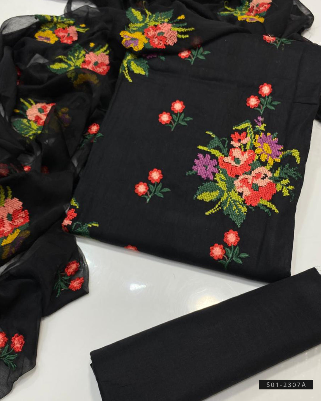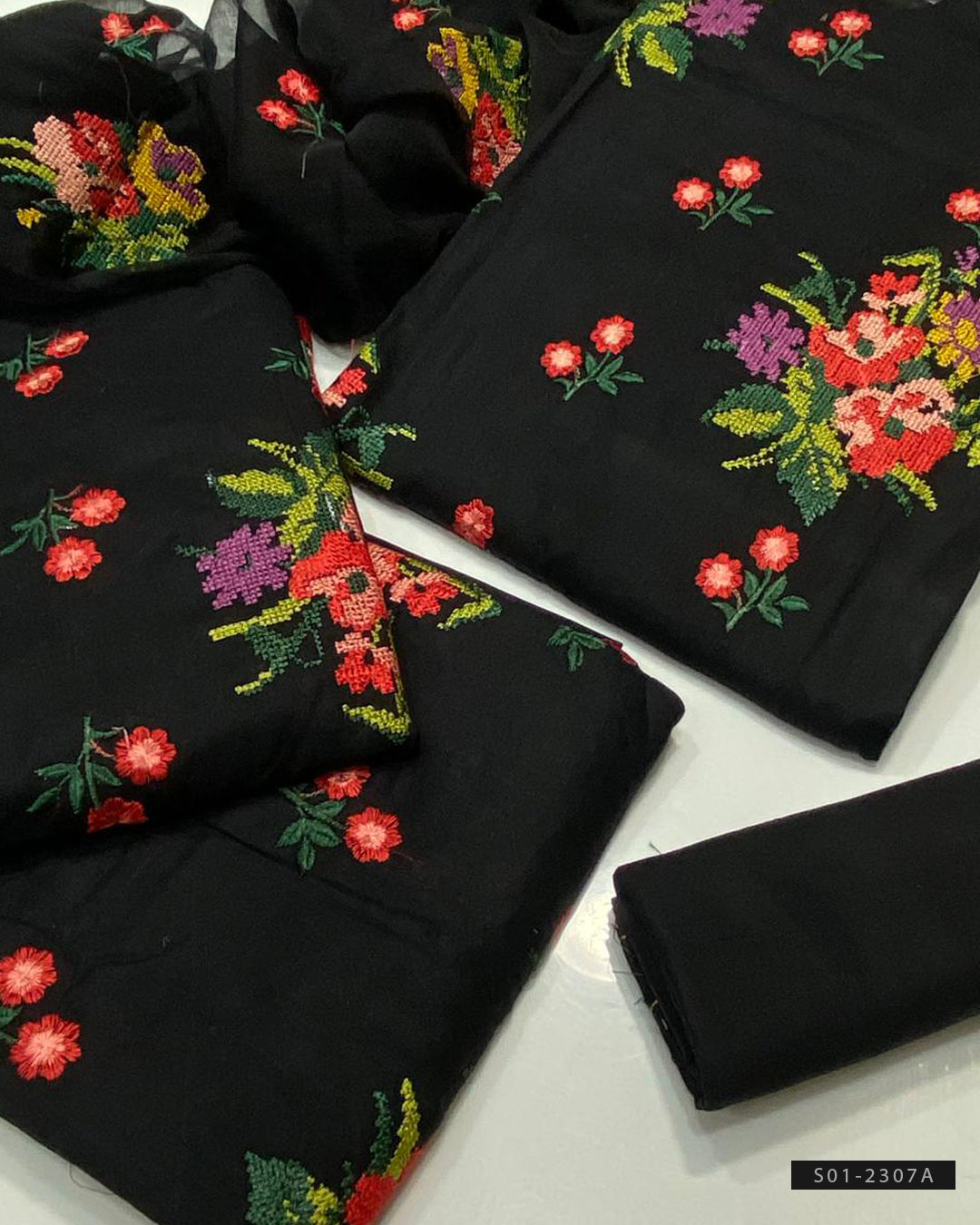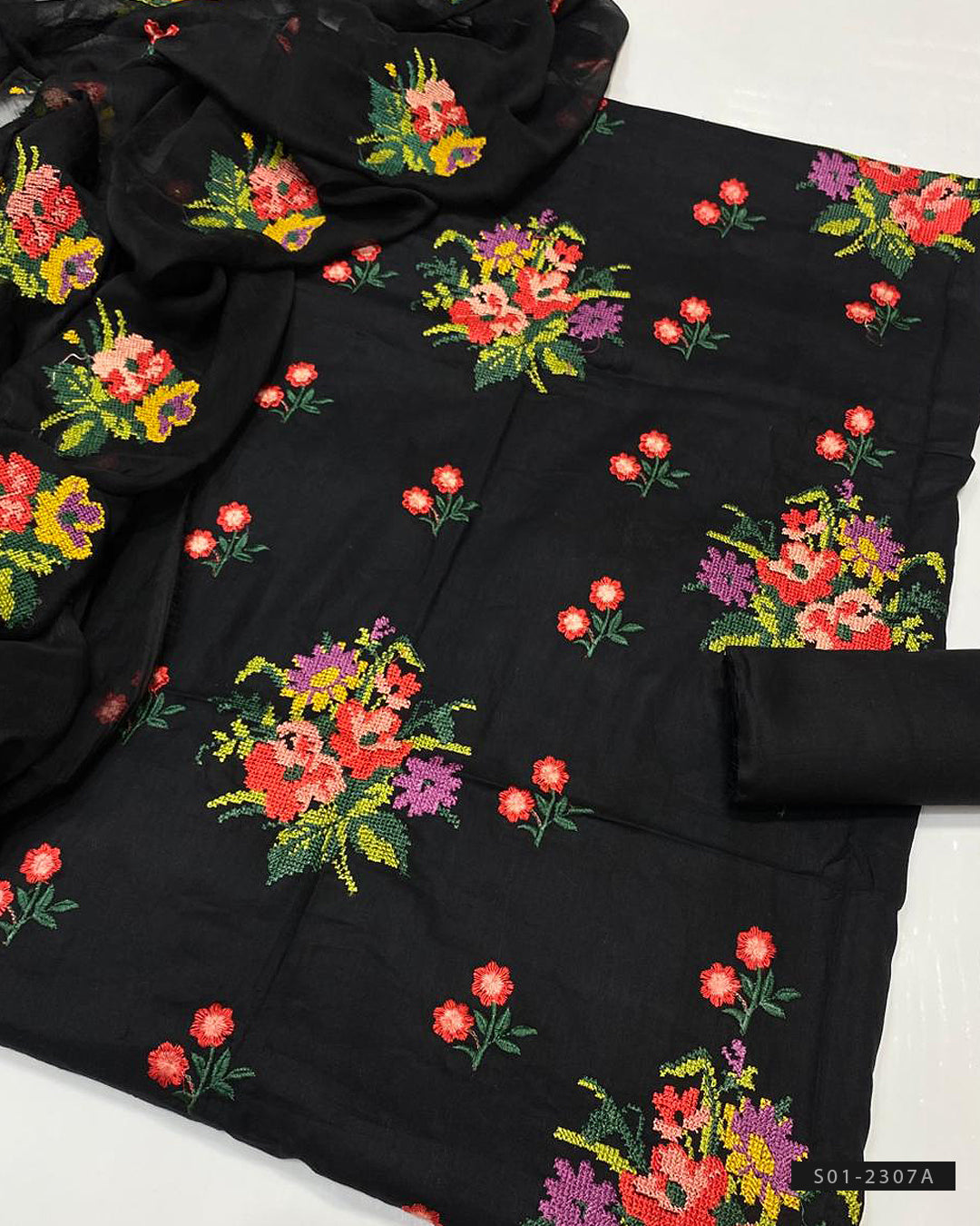 Fabric Detail:-Machine Cross Stitch Embroidered Lawn Shirt + Embroidered Chiffon Dupatta + Plain Lawn Trouser