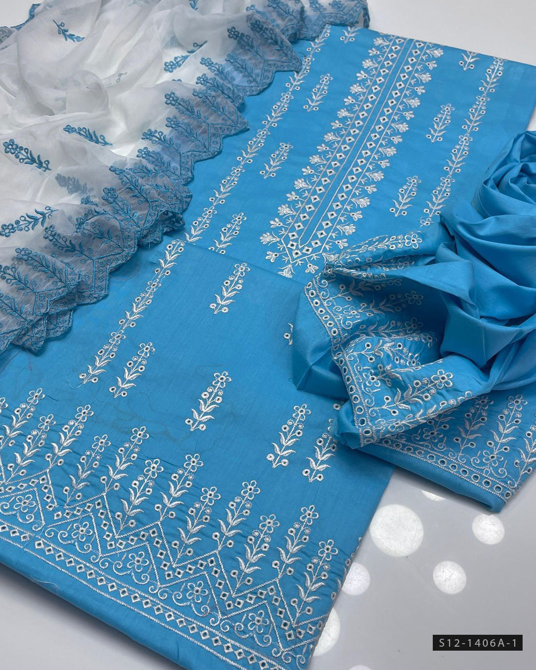 Fabric Detail:- Shirt Chickenkari embroidery on breathable cotton lawn, blending tradition with contemporary style. Dupatta Lightweight chiffon with intricate embroidery, adding an elegant flair. Trouser Embroidered cotton lawn,...