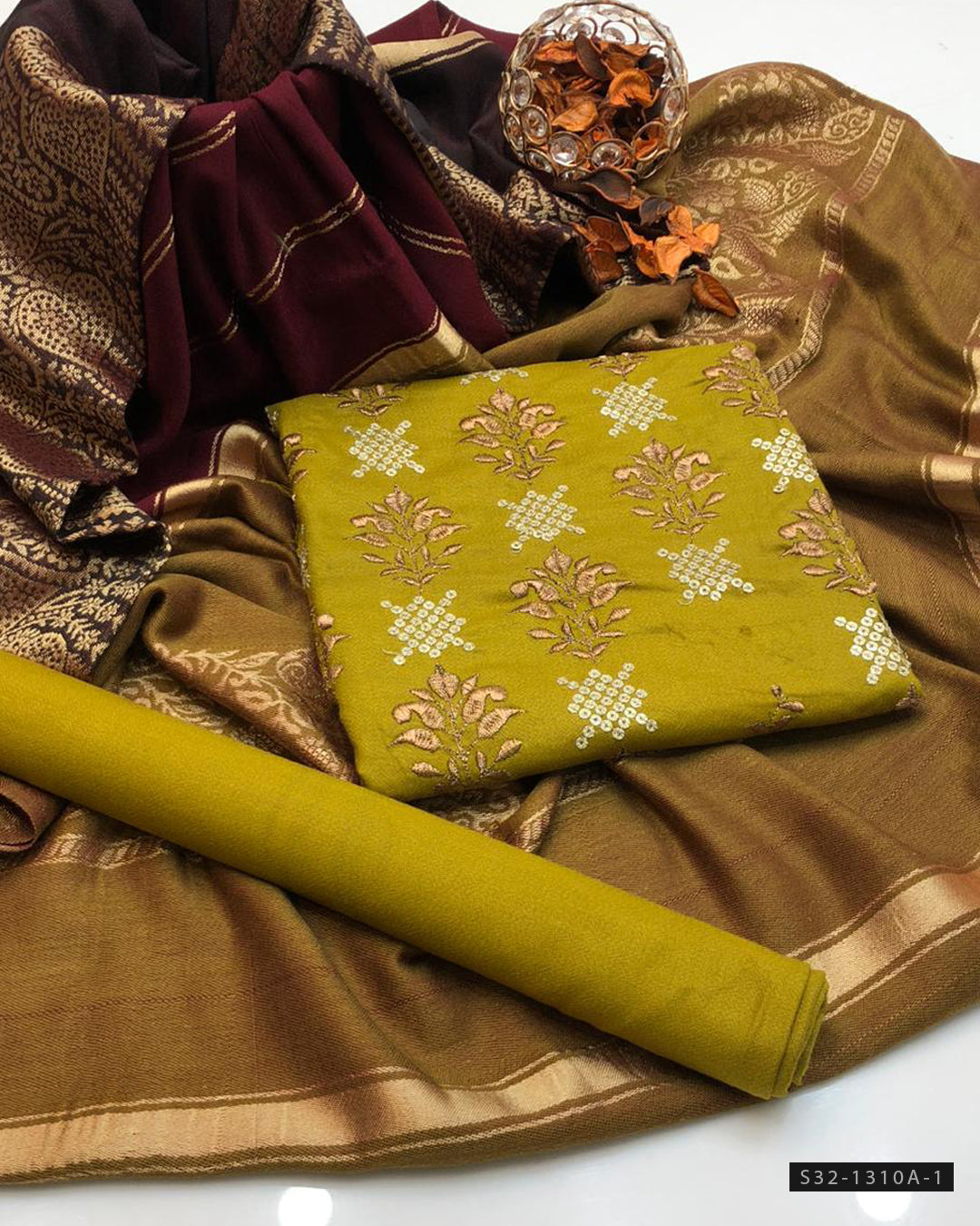 Fabric Detail:-Marina Embroidered Shirt + Plain Marina Trouser + Pashmina Wool Multi Banarsi Shawl