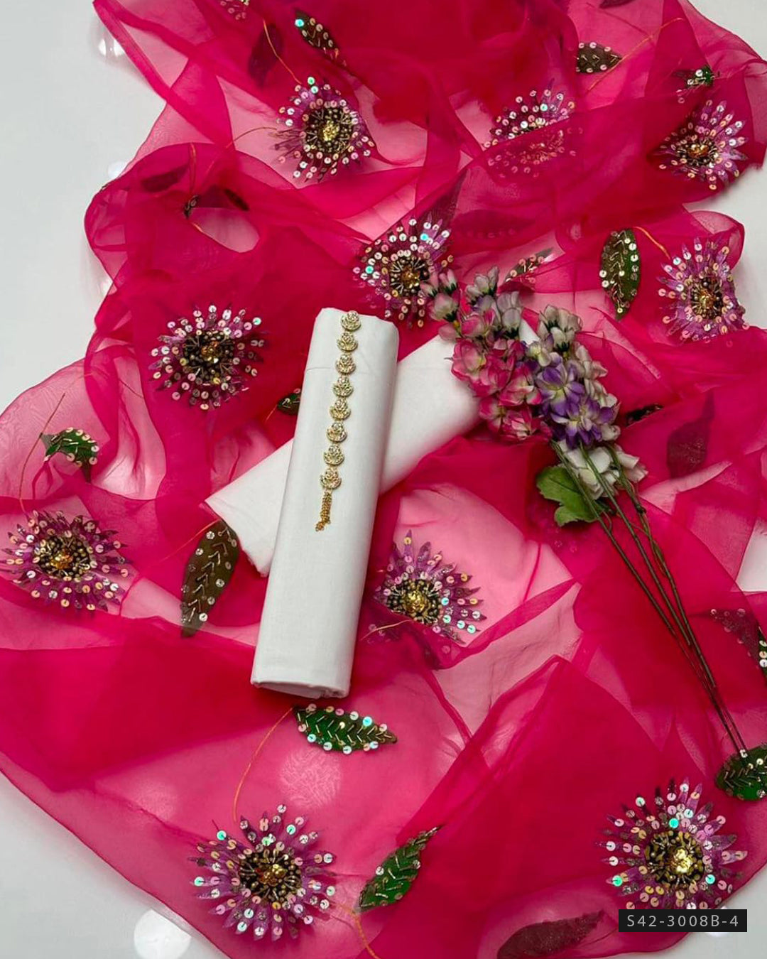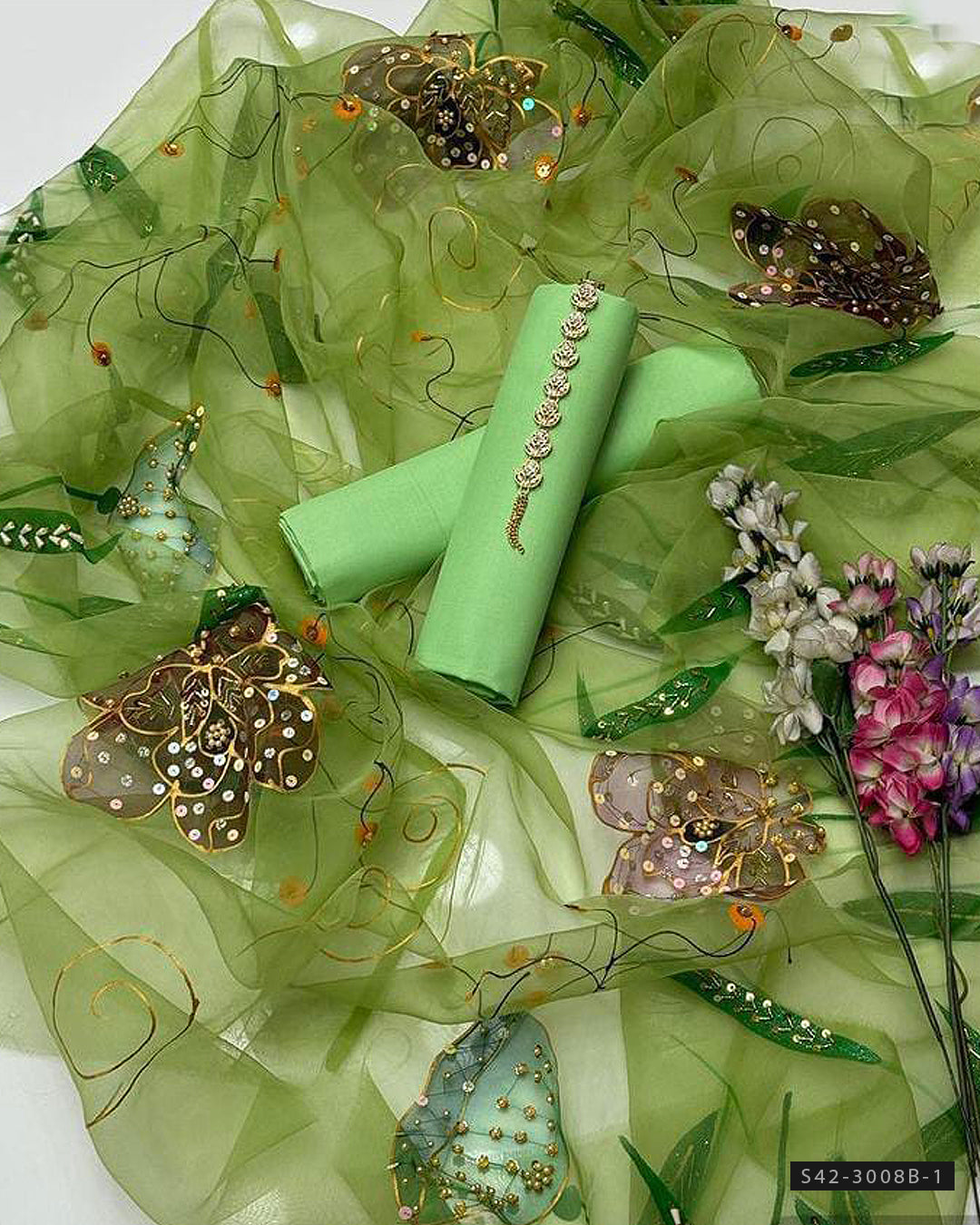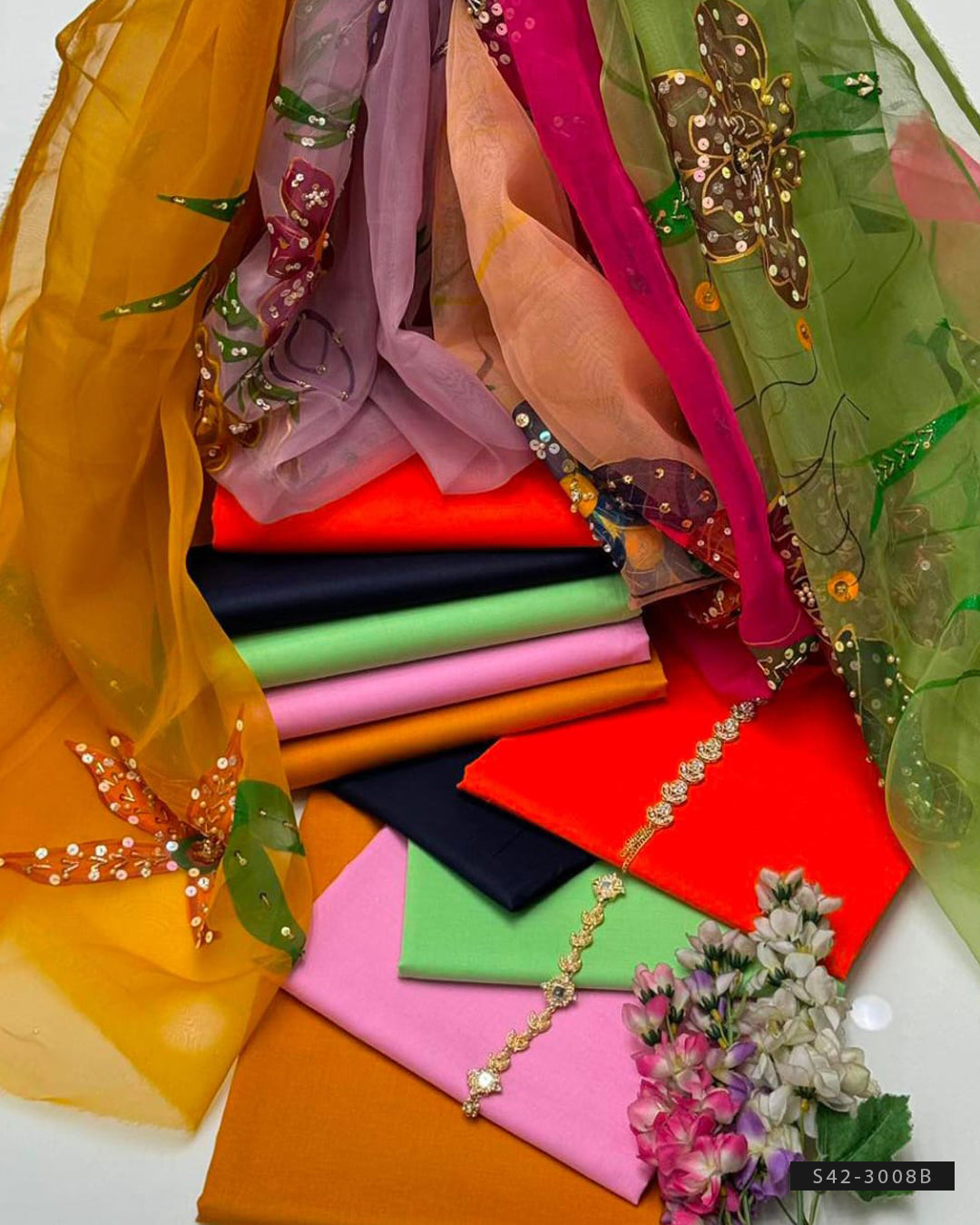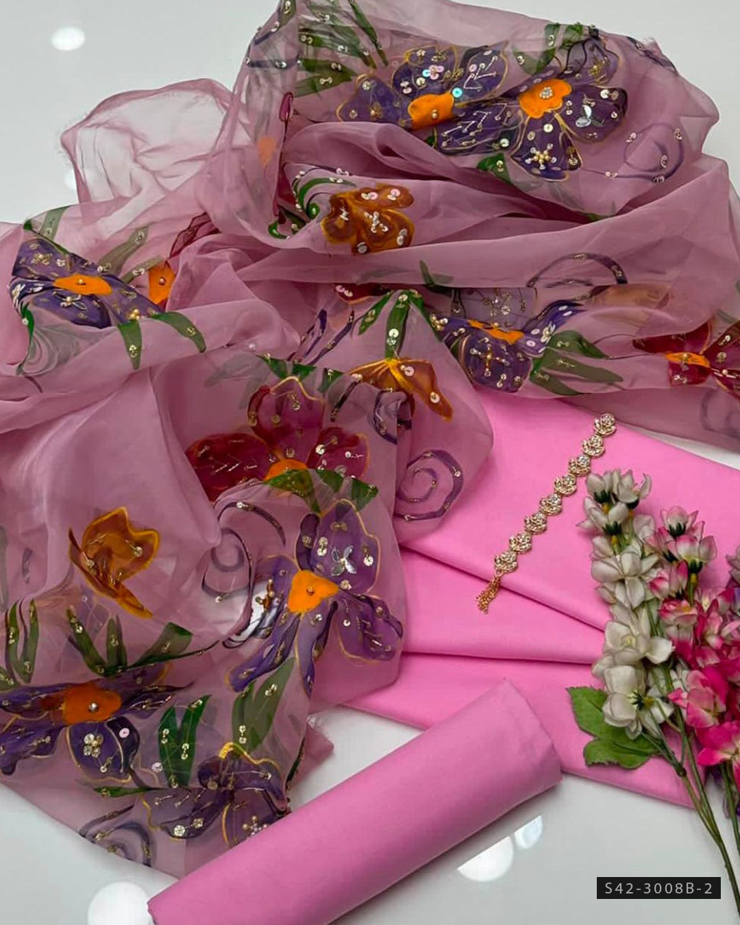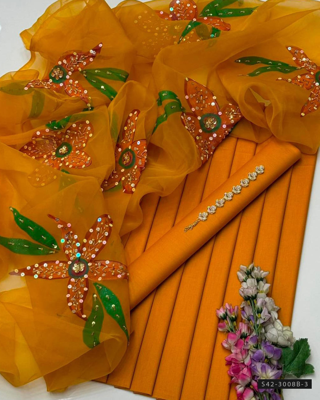 Fabric Detail:- Plain Katan Silk Shirt & TrouserCut Dana Sitara Work Brush Paint Organza DupattaNeckline Free An elegant fancy wear ensemble that adds sparkle and sophistication...