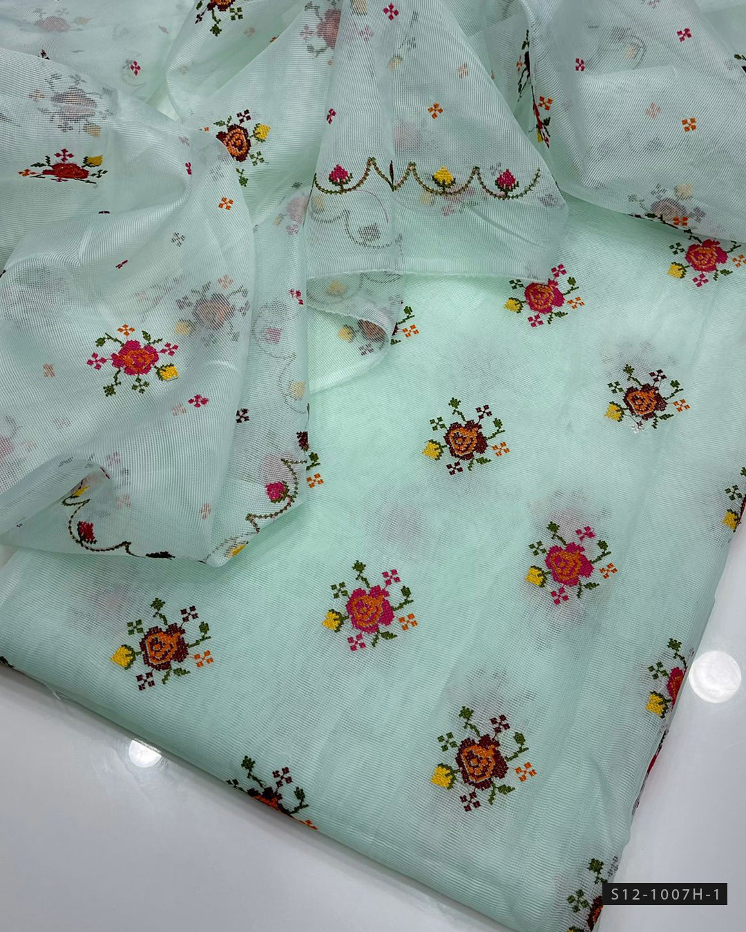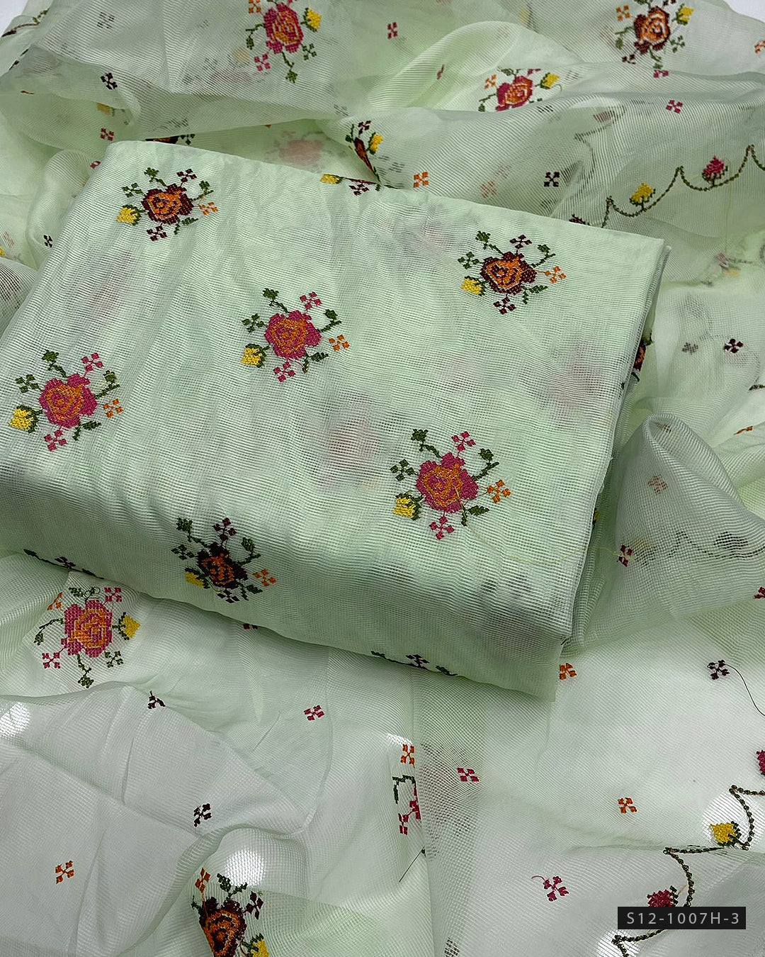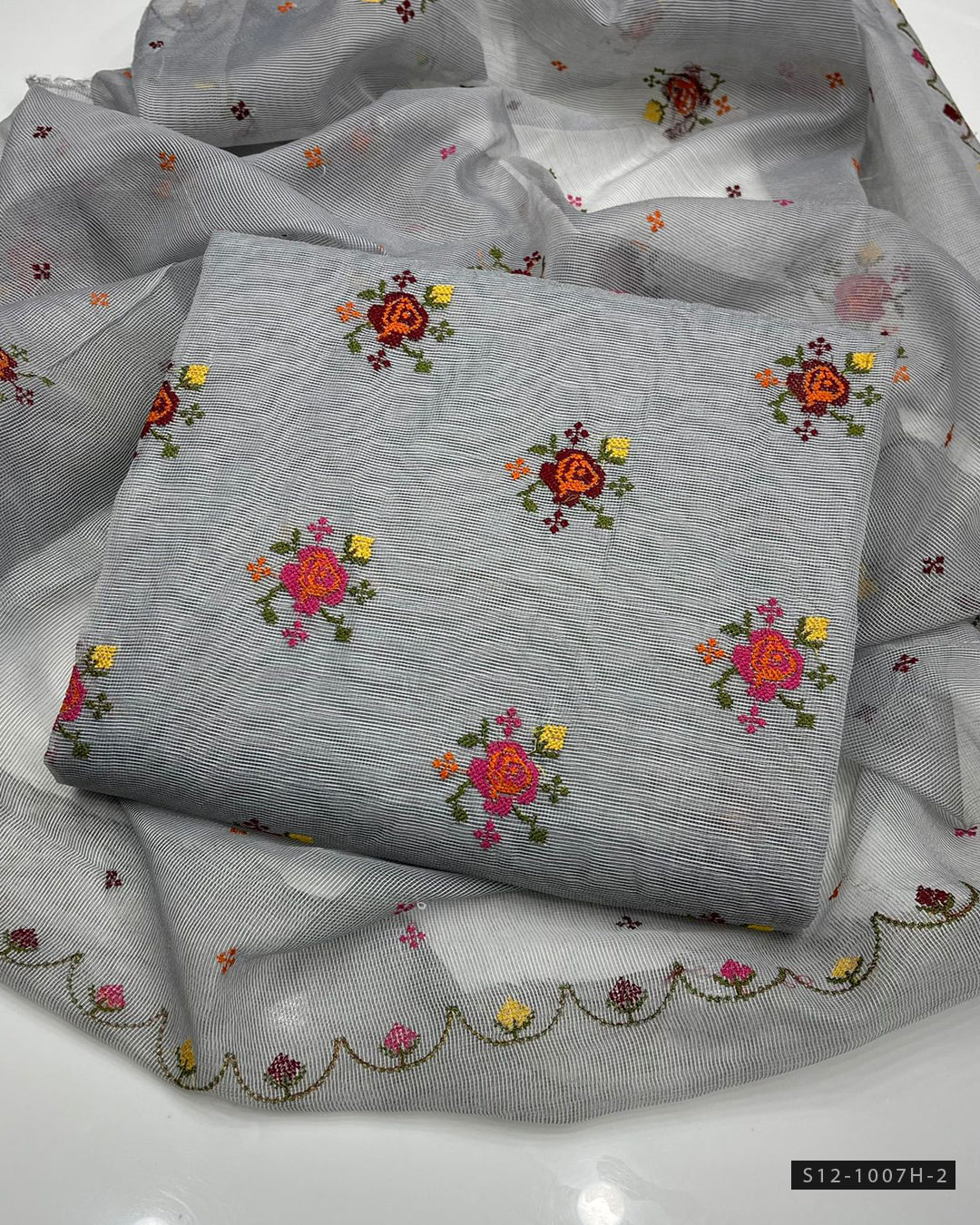 Shirt: Khadi net with beautiful cross stitch embroideryDupatta: Matching khadi net with elegant embroidery