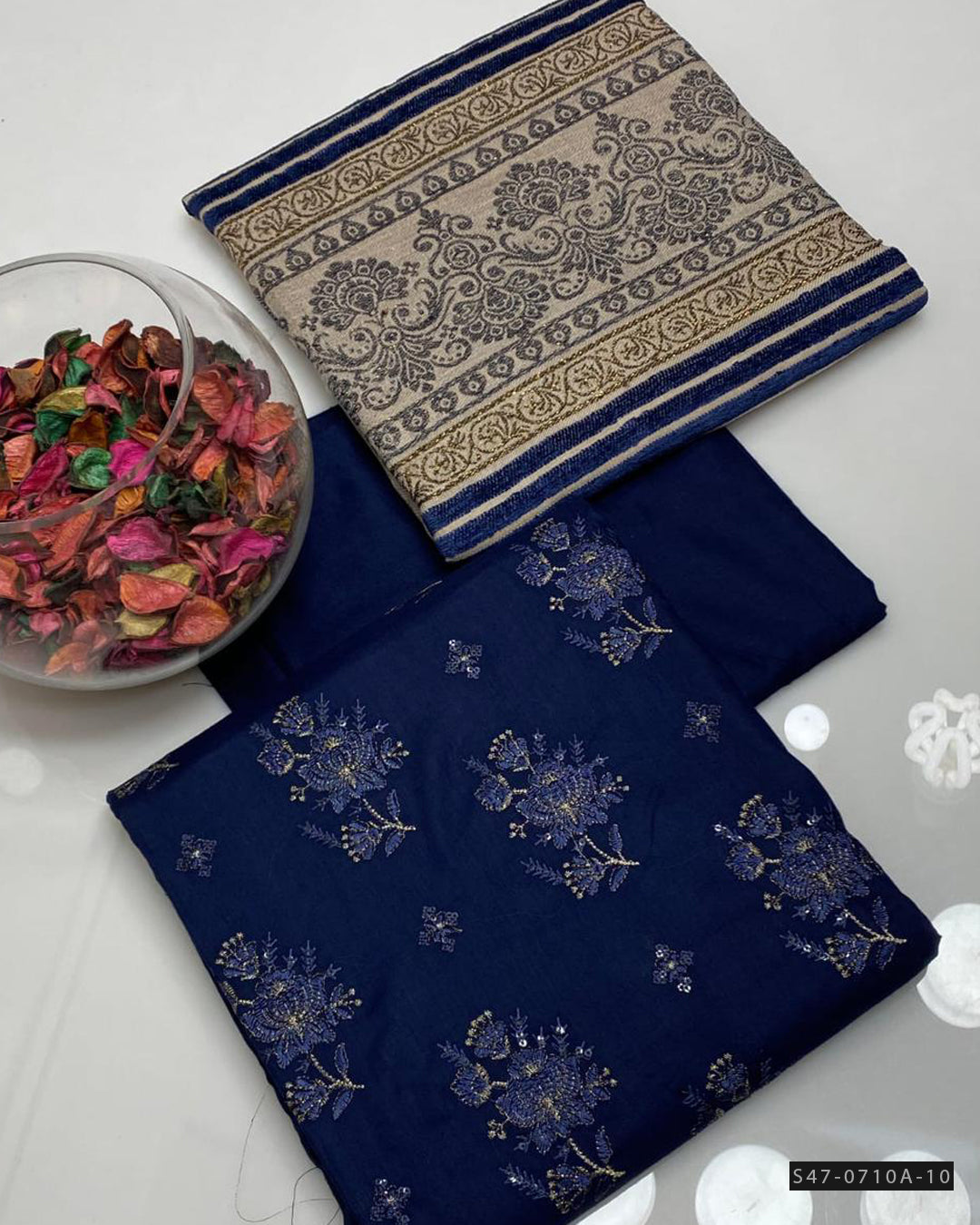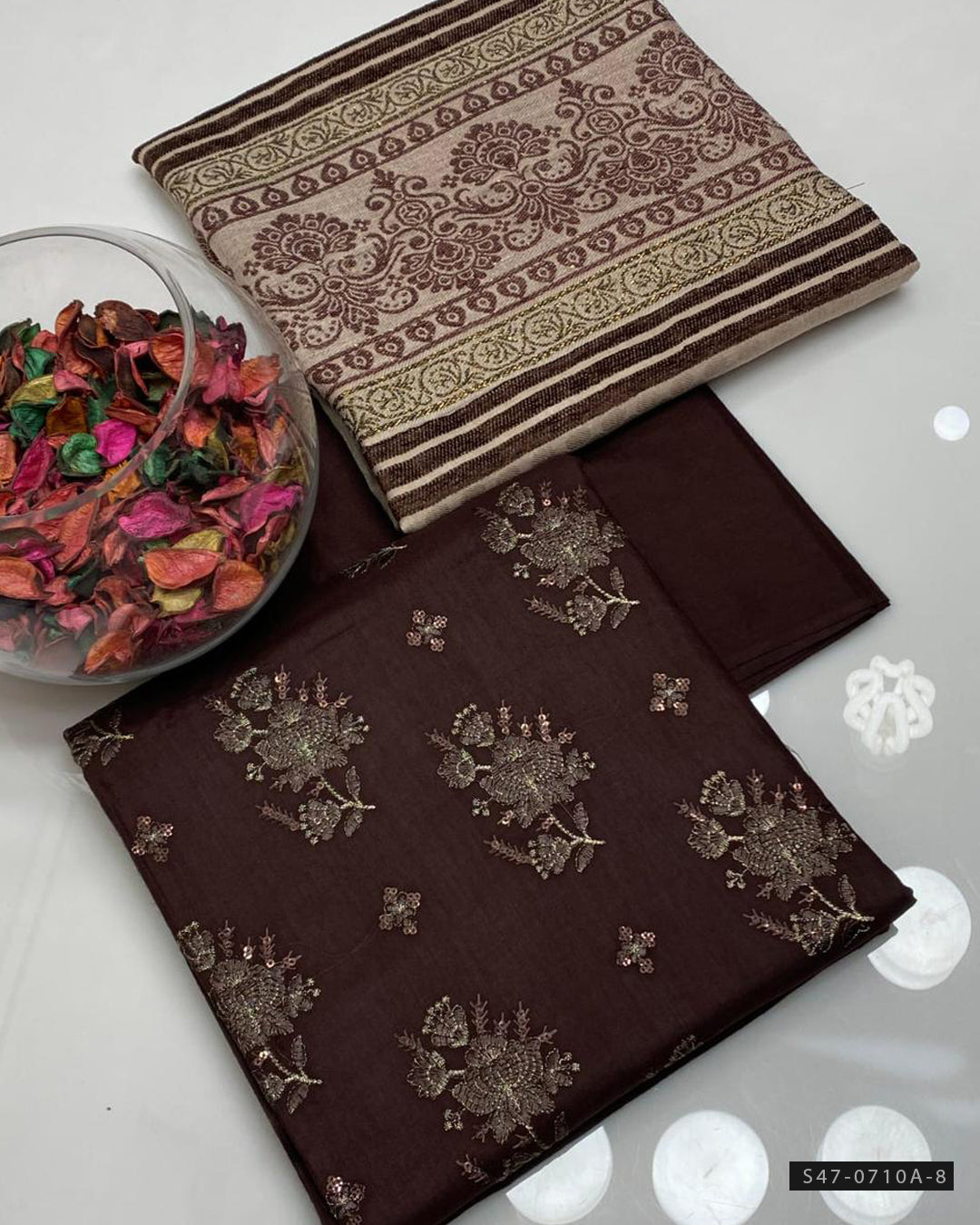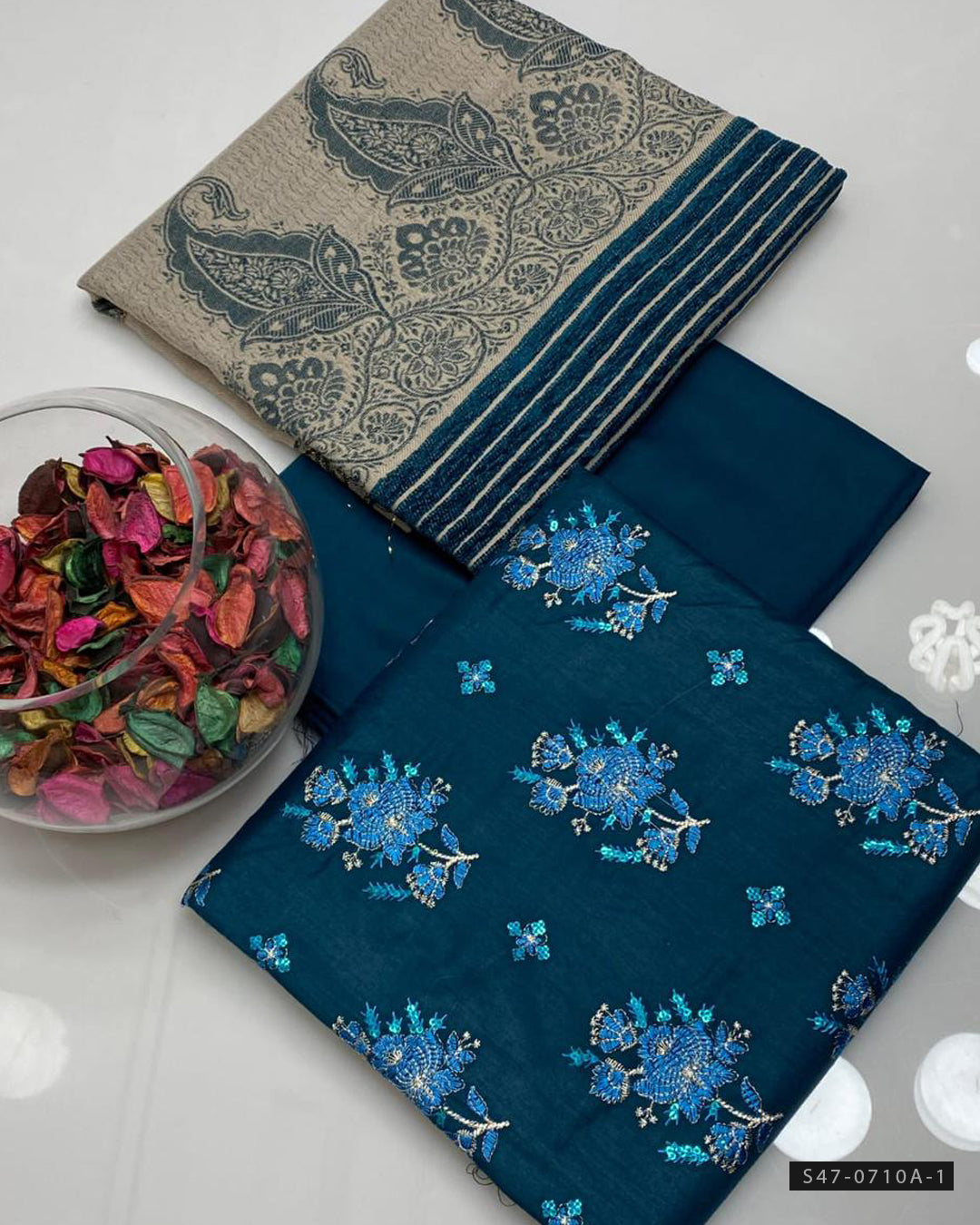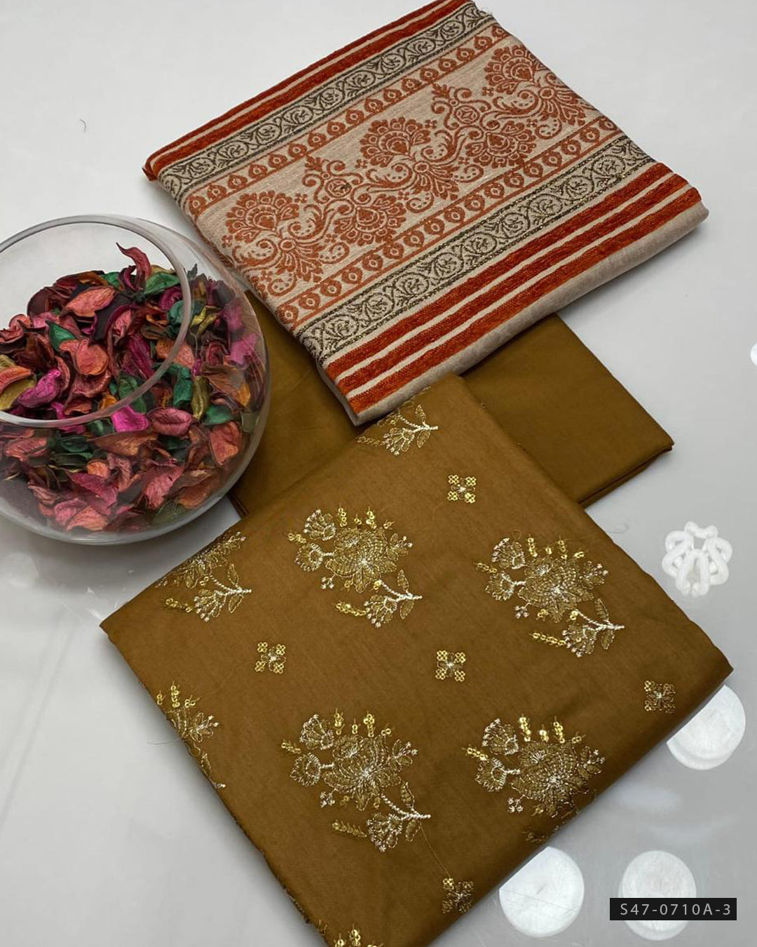 Fabric Detail:-All-over Embroidered Shirt on Premium Marina Linen + Shawl with Velvet Border Jacquard Design + Plain Marina Linen Trouser