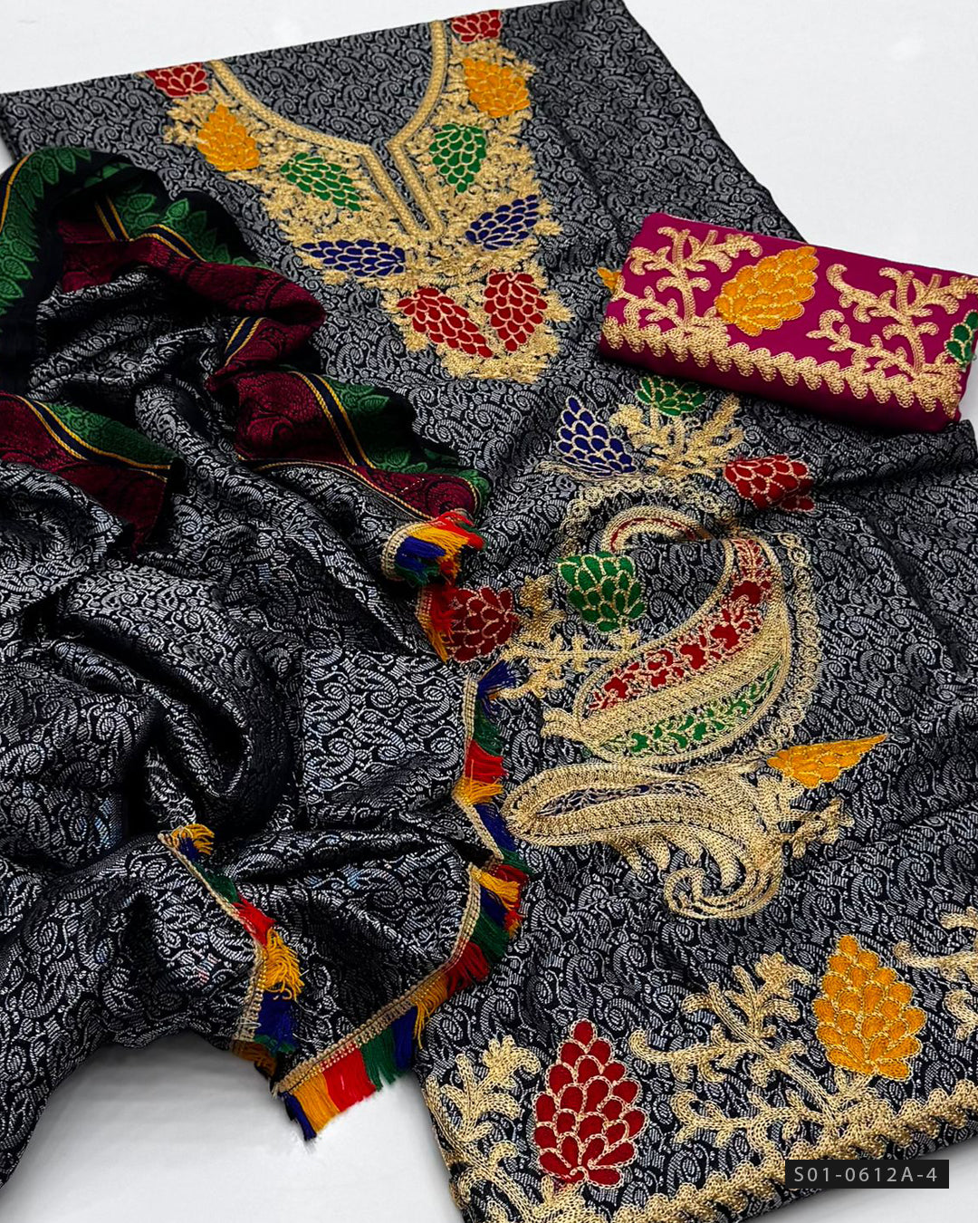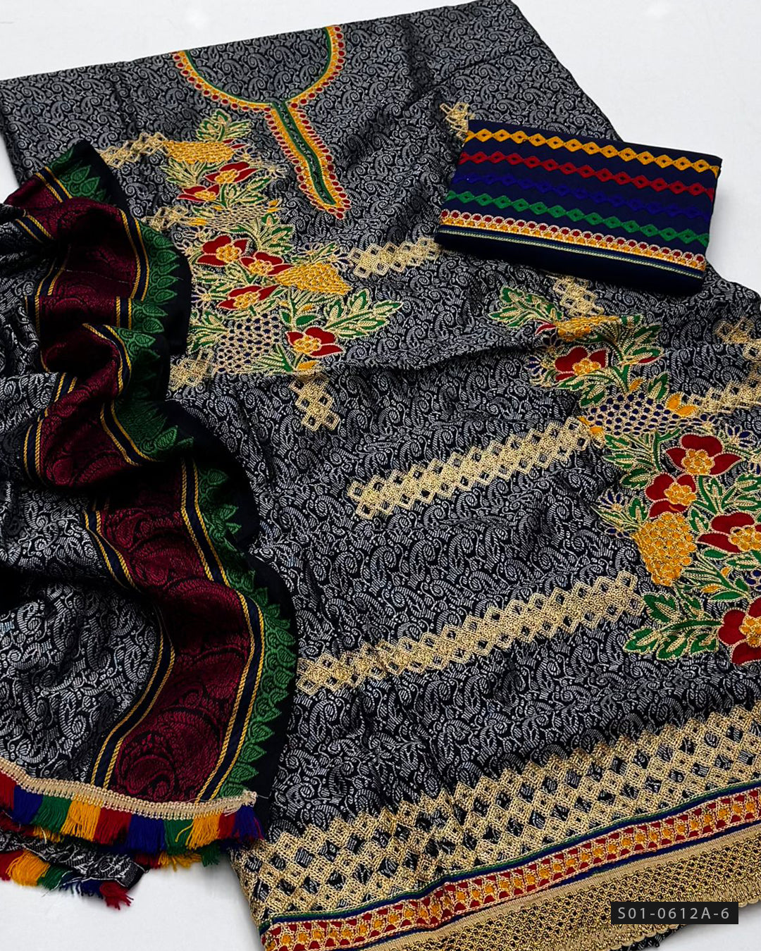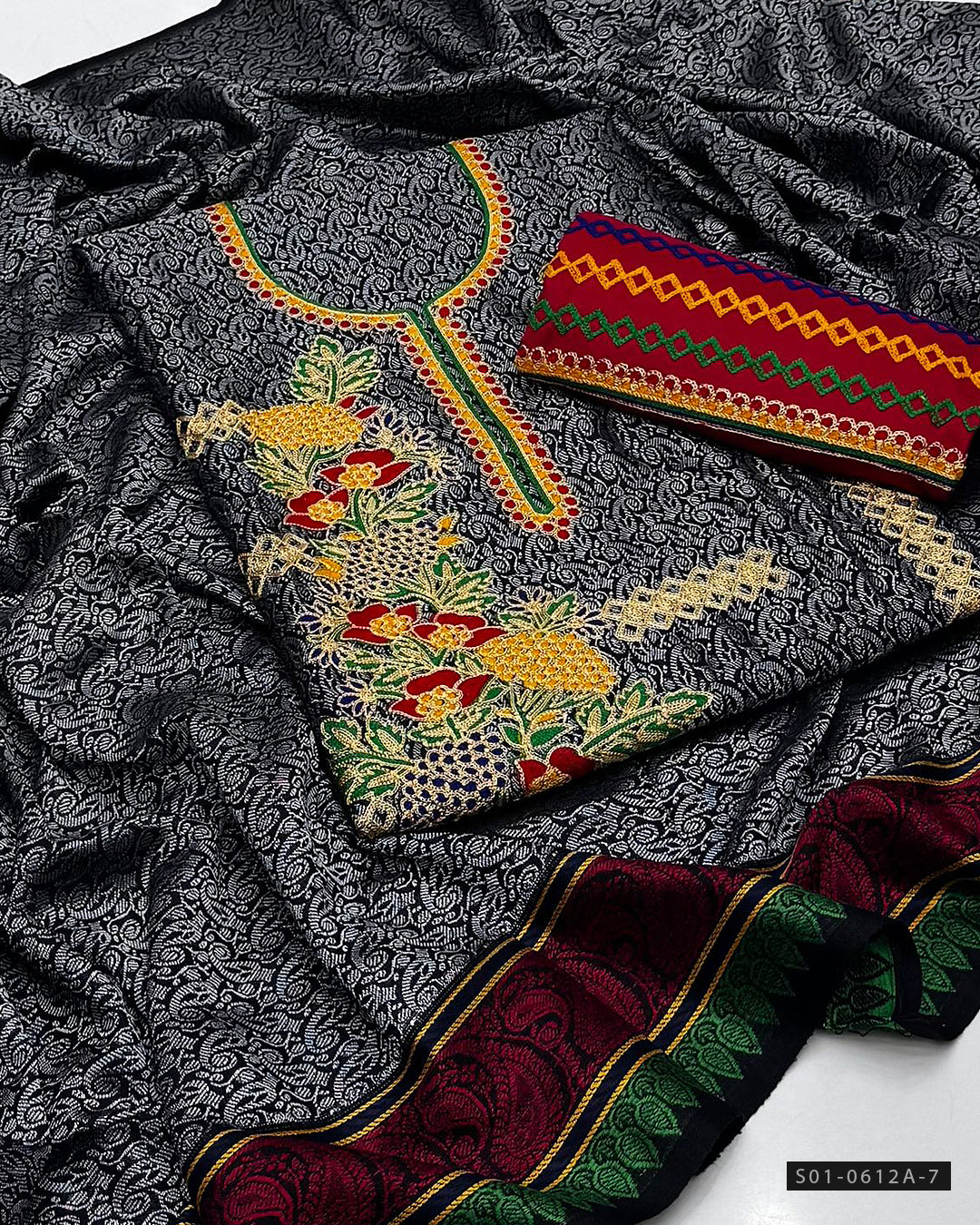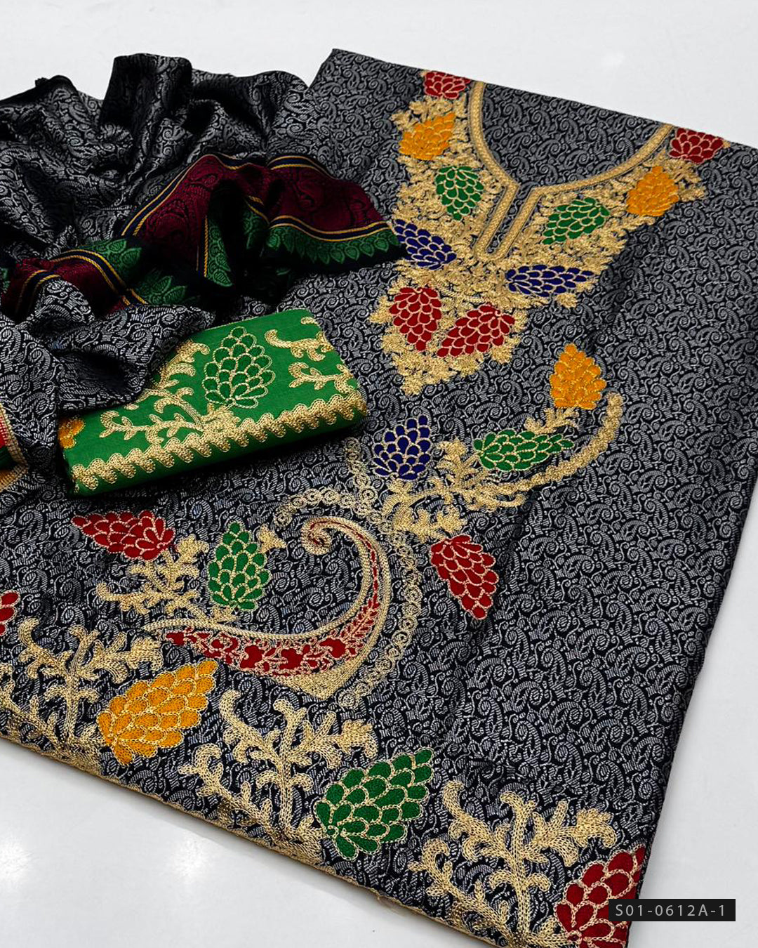 Fabric Details:-Jacquard Marina Shirt – Beautiful Aari embroidery + Marina Trouser – Fully embroidered + Jacquard Shawl Dupatta – Matching & stylish