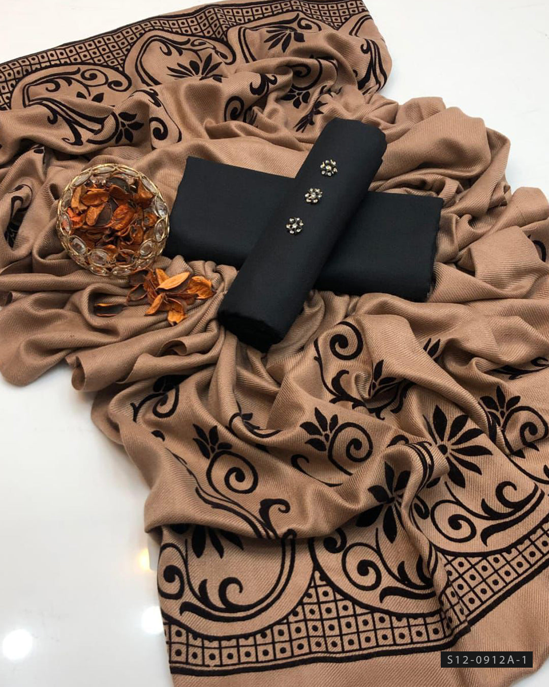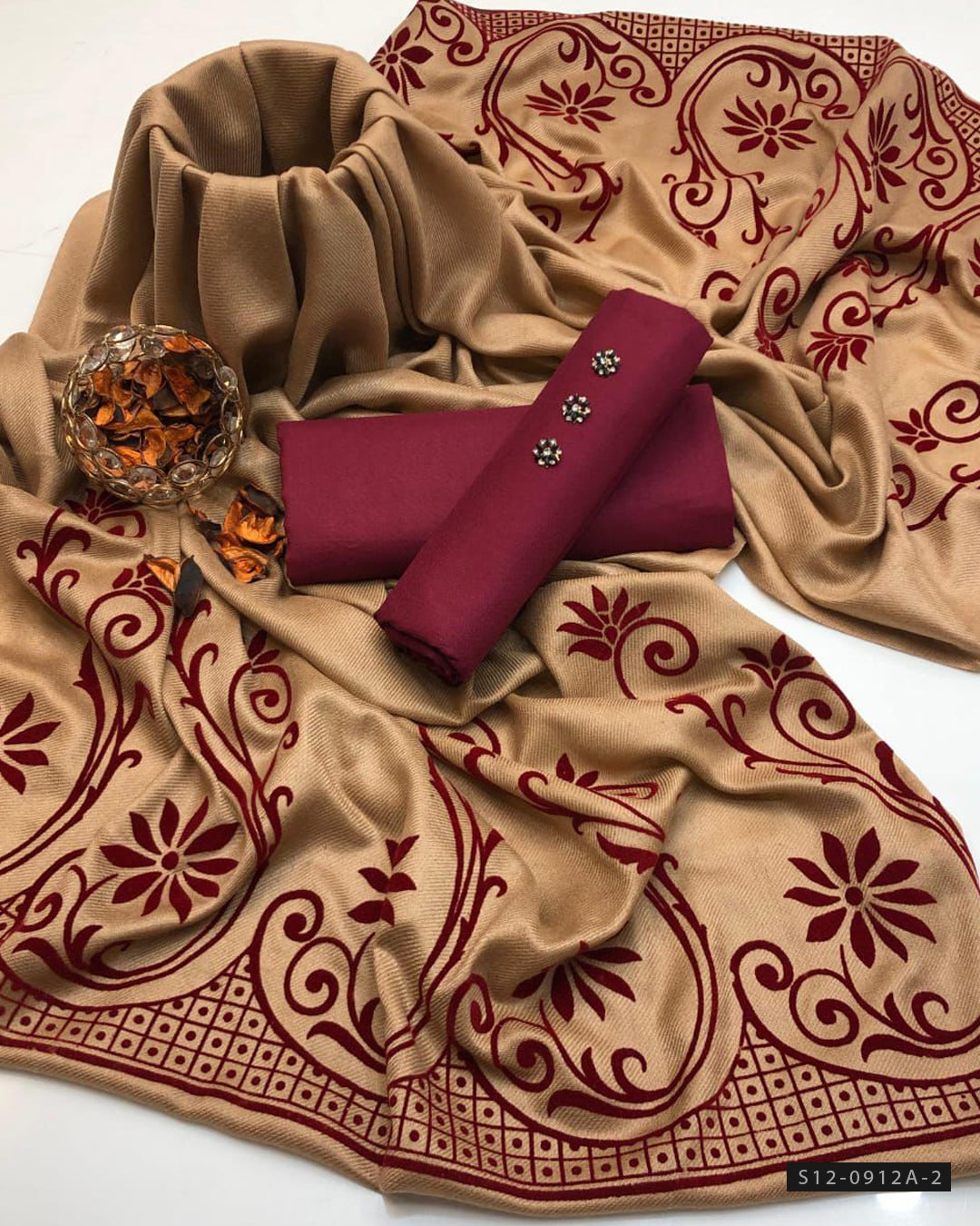 Fabric Detail:-Pashmina Wool Velvet Applique Shawl + Plain Marina Wool Shirt + Plain Marina Wool Trouser