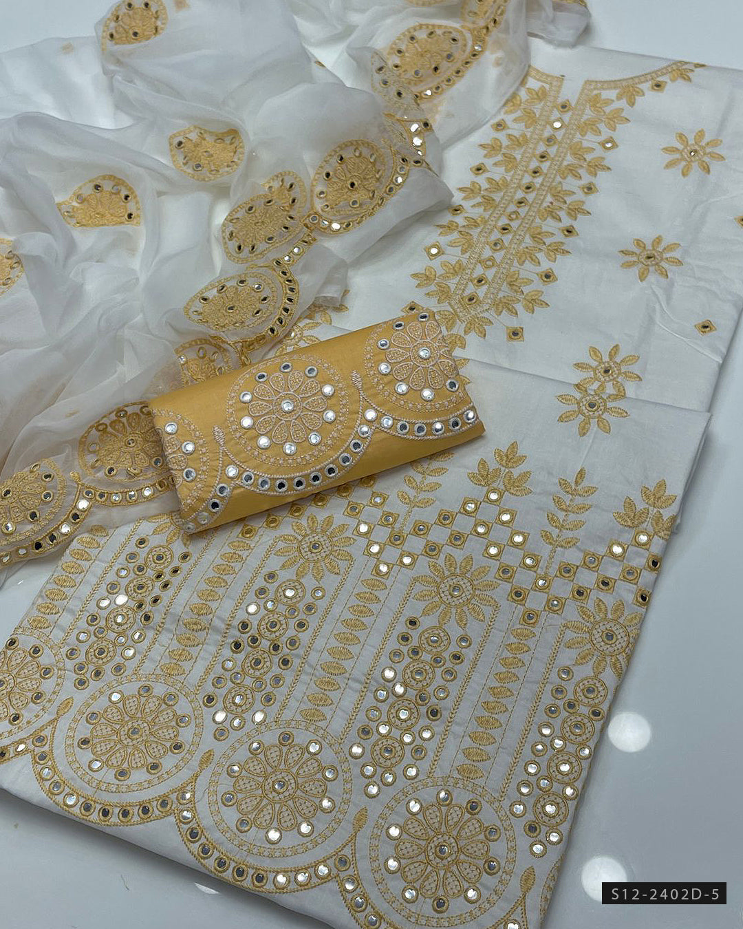Mirror Work Embroidered Cotton Lawn ShirtEmbroidered Mirror Work Chiffon DupattaCotton Lawn Embroidered Trouser