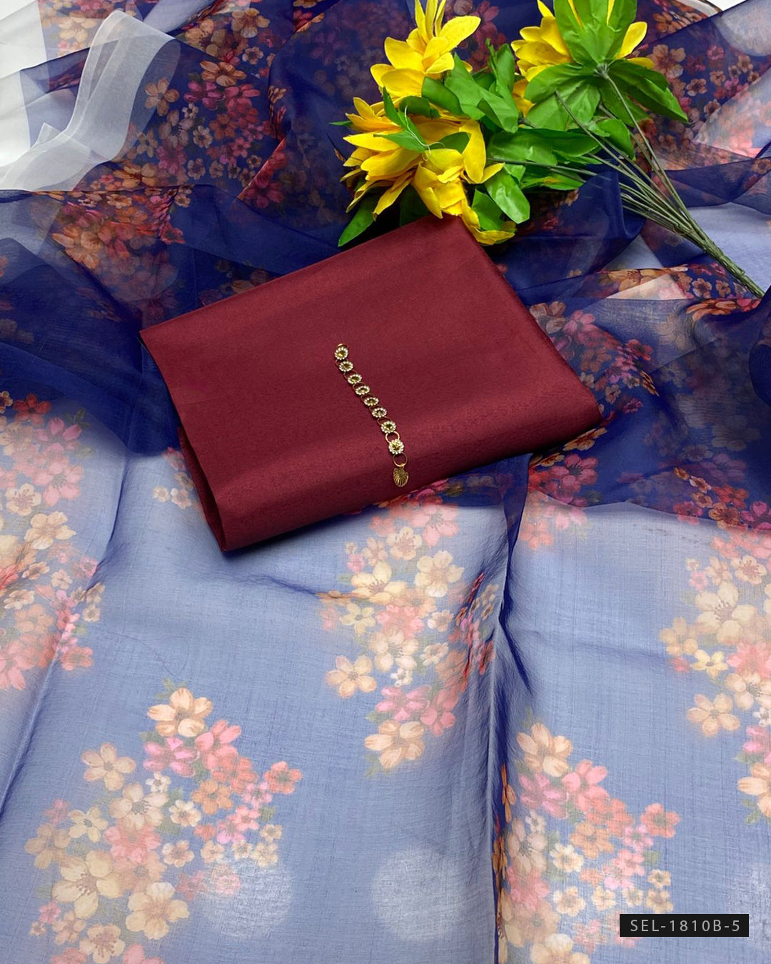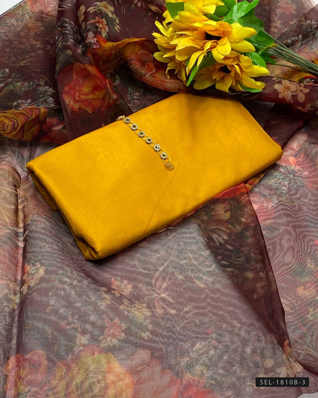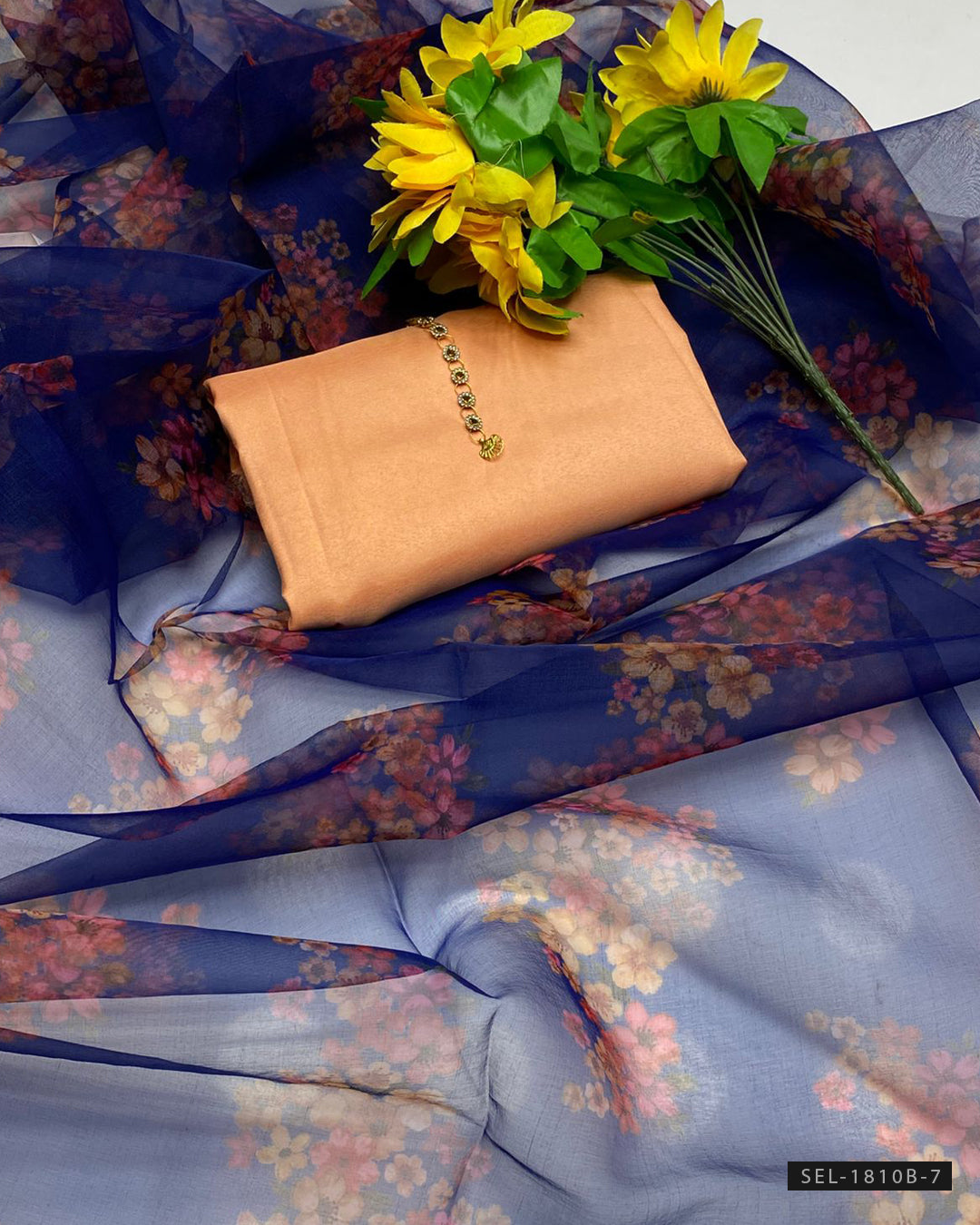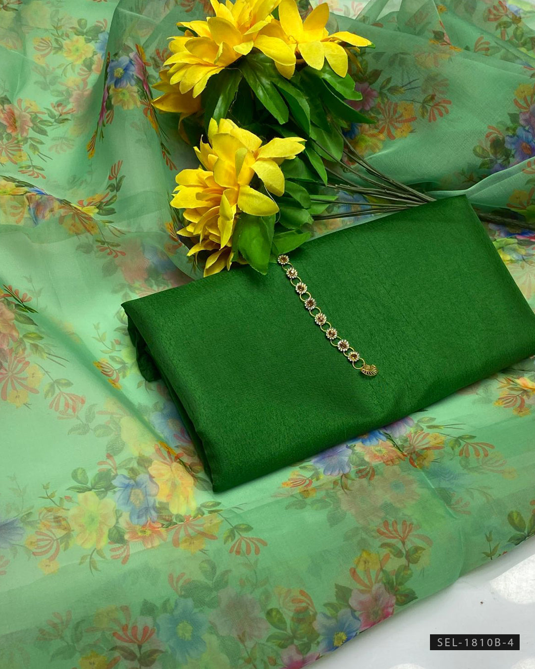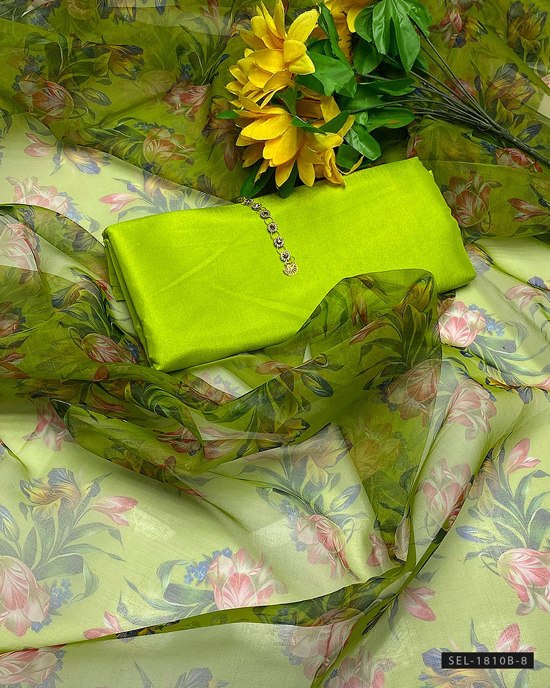 Katan Silk Shirt (Without Neckline) + Plain Katan Silk Trouser + Printed Organza Dupatta + stylish aur comfortable outfit, har formal occasion ke liye perfect.