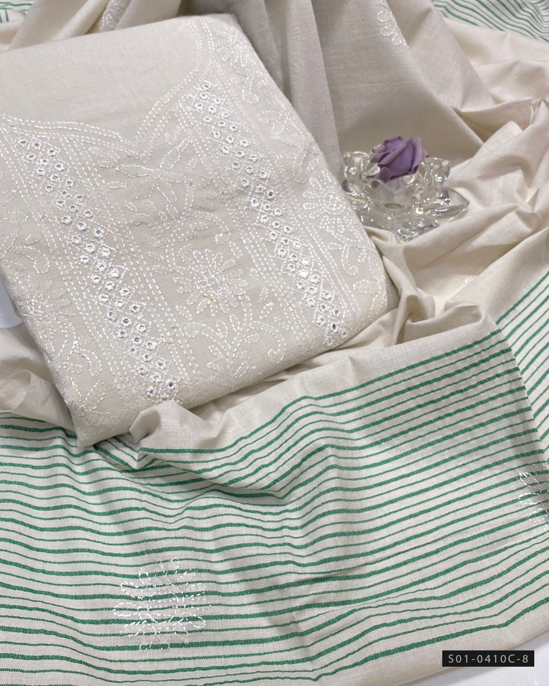 Fabric Detail:-Handmade Shadow Embroidery with Sheesha Work on Khaddar Shirt + Khaddar Dupatta Shawl + Khaddar Embroidered Trouser