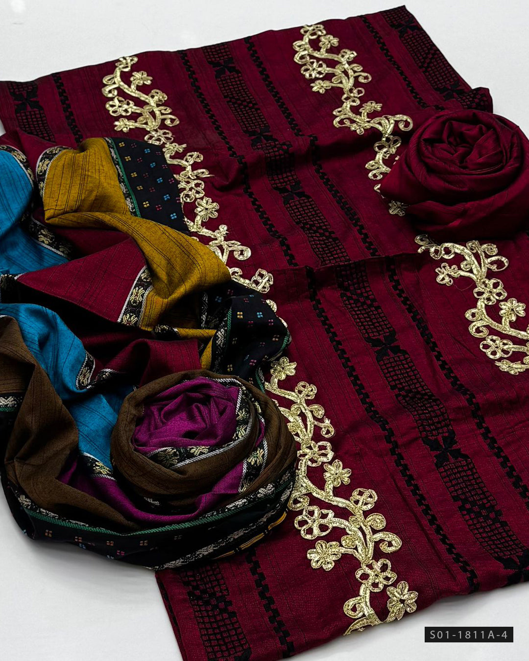Fabric Detail:-Tarkashi-style Embroidered Susi Shirt & Trouser + Beautiful multi-color Shawl Dupatta
