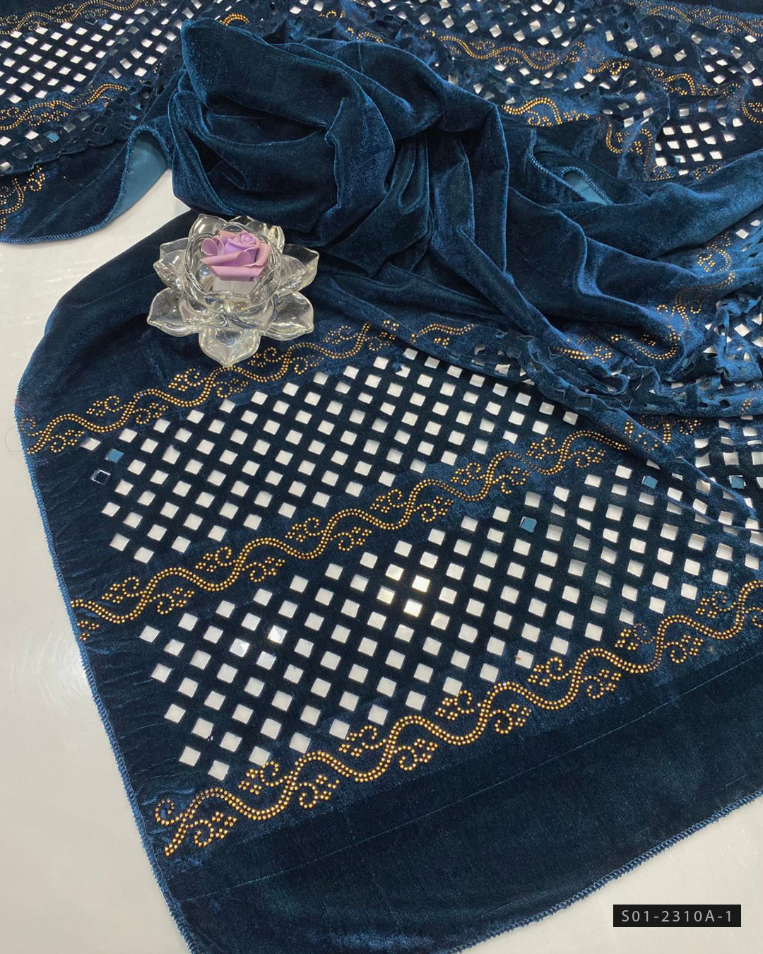 Fabric Detail:-Velvet Shawl with Gold Embroidery & Cutwork Design + Length: 85 inches + Width: 38 inches