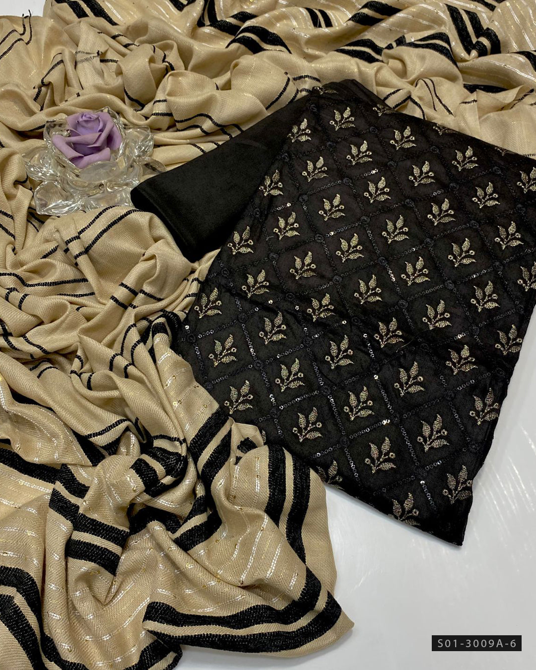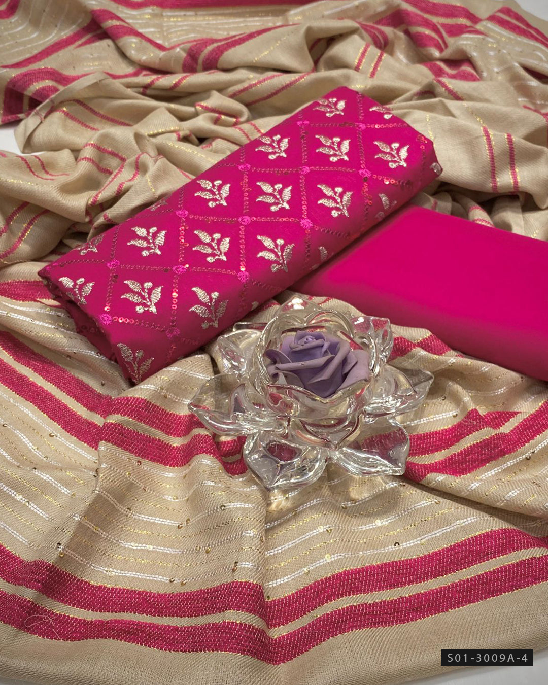 Fabric Detail:-Sequins Work Embroidered Marina Linen Shirt + Plain Marina Trouser + Acrylic Wool Shawl with Velvet Border