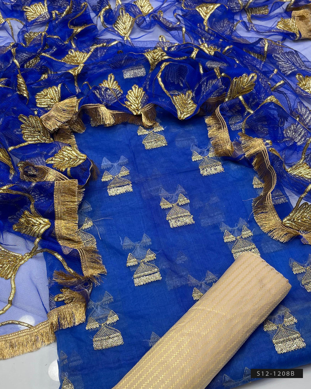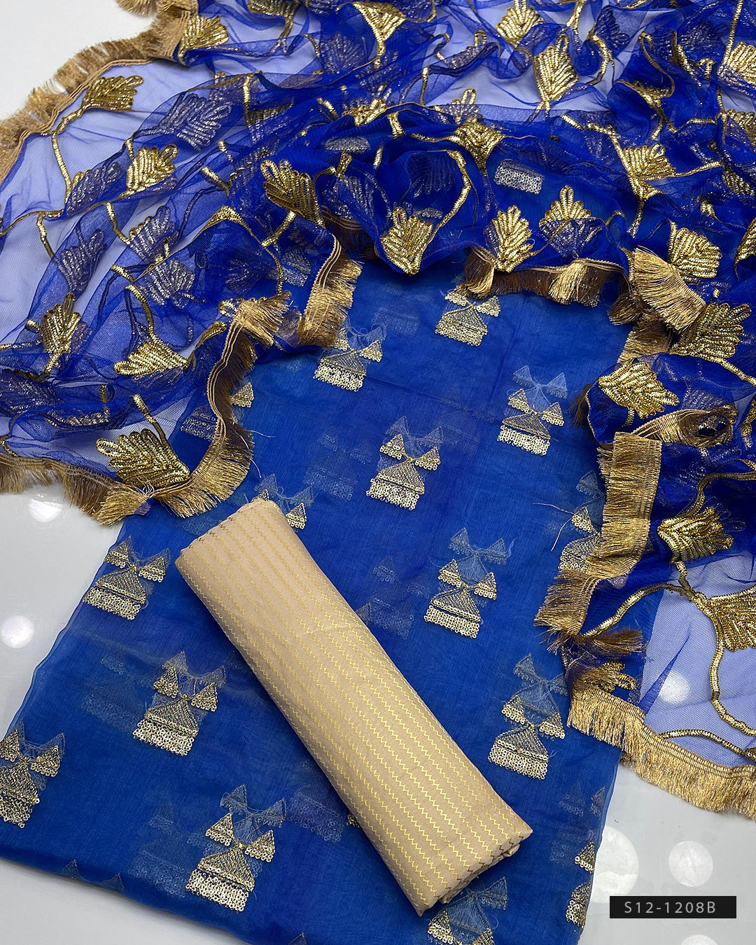 Fabric Detail:-Sequins Work Embroidered Organza ShirtGotta Work Net DupattaMasouri Trouser
