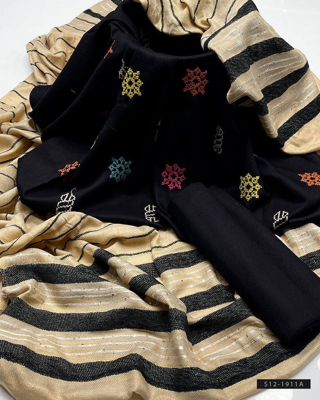 Fabric Detail:-Multi Color Embroidered Dhanak Shirt + Pashmina Wool Velvet Shawl + Plain Dhanak Trouser