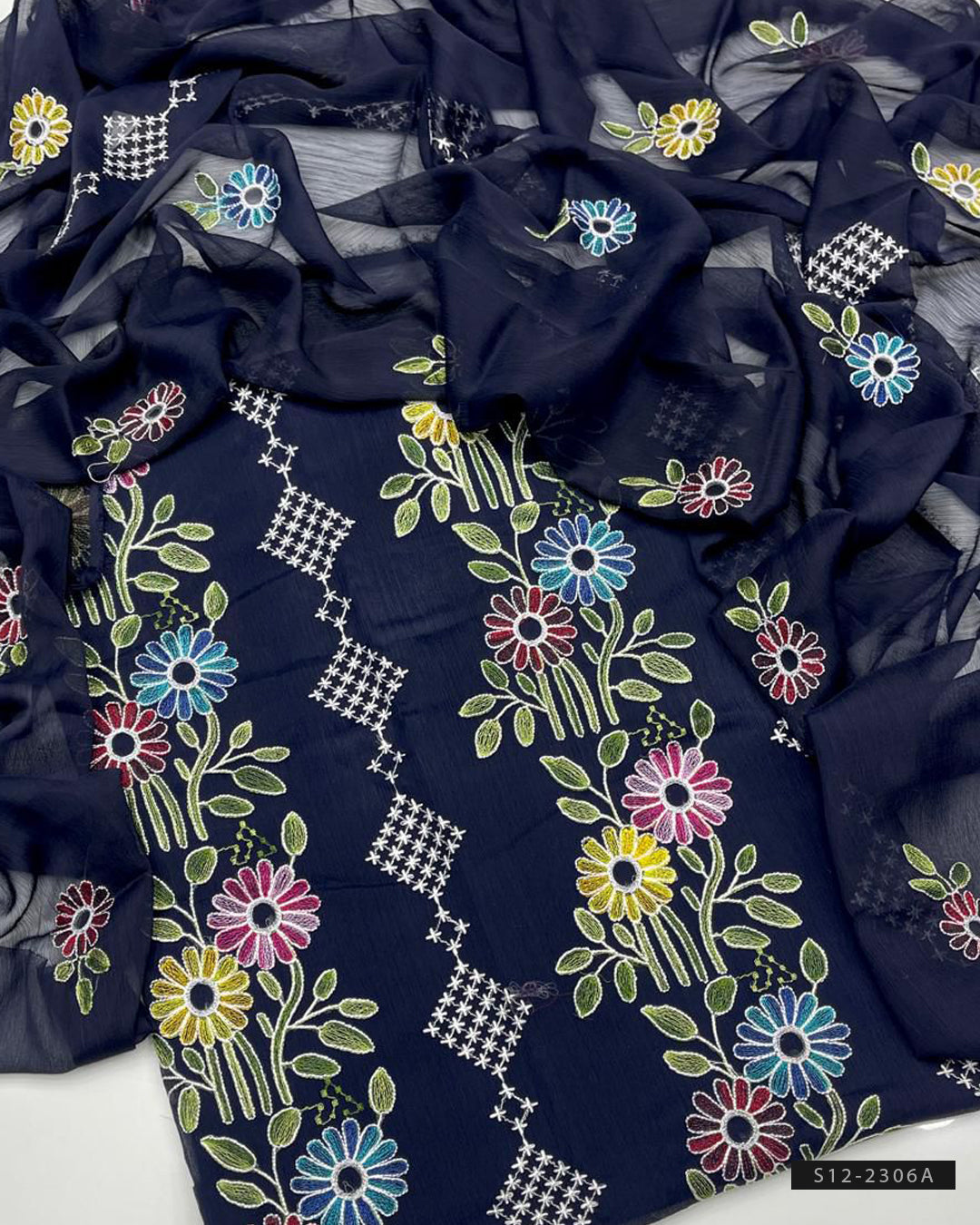 Product Detail:- Shirt Multi-color embroidery on premium chiffon, offering vibrant elegance. Dupatta & Sleeves Delicately embroidered chiffon for a graceful and refined finish. A perfect choice for women...