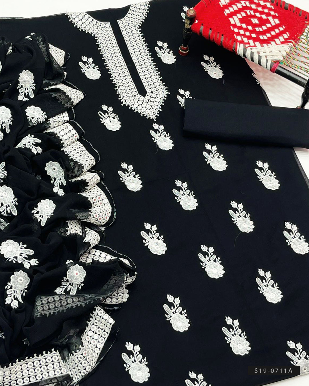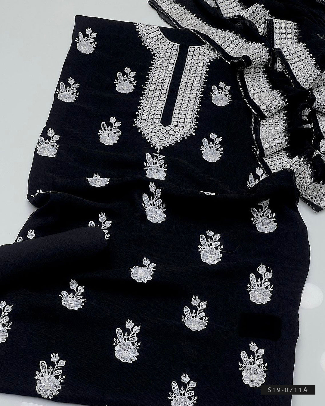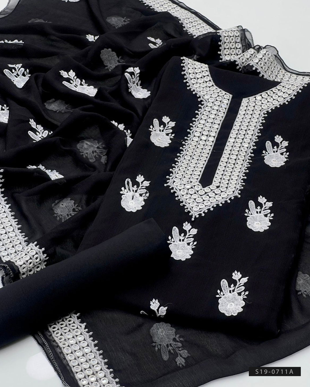 Fabric Detail:-Chiffon shirt with machine embroidery + DMatching chiffon dupatta with machine embroidery + Plain grip trouser + Back & Sleeves fully Embroidered