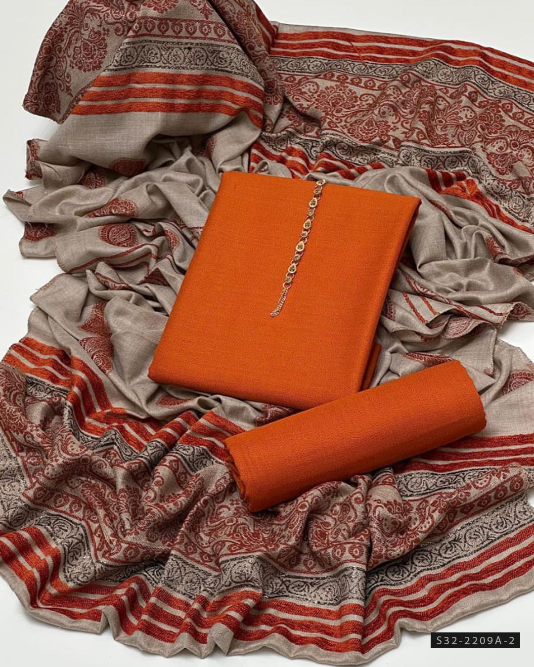 Fabric Detail:-Pure Soft Marina Plain Shirt + Pure Marina Trouser + Jacquard Heavy Velvet Work Tilka Shawl