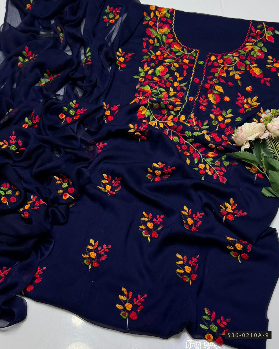 Fabric Detail:-Handmade Spring Gala Boti Embroidered Crinkle Chiffon Shirt + Crinkle Chiffon Dupatta with Boti Work Embroidery + Embroidered Sleeves with Plain Back