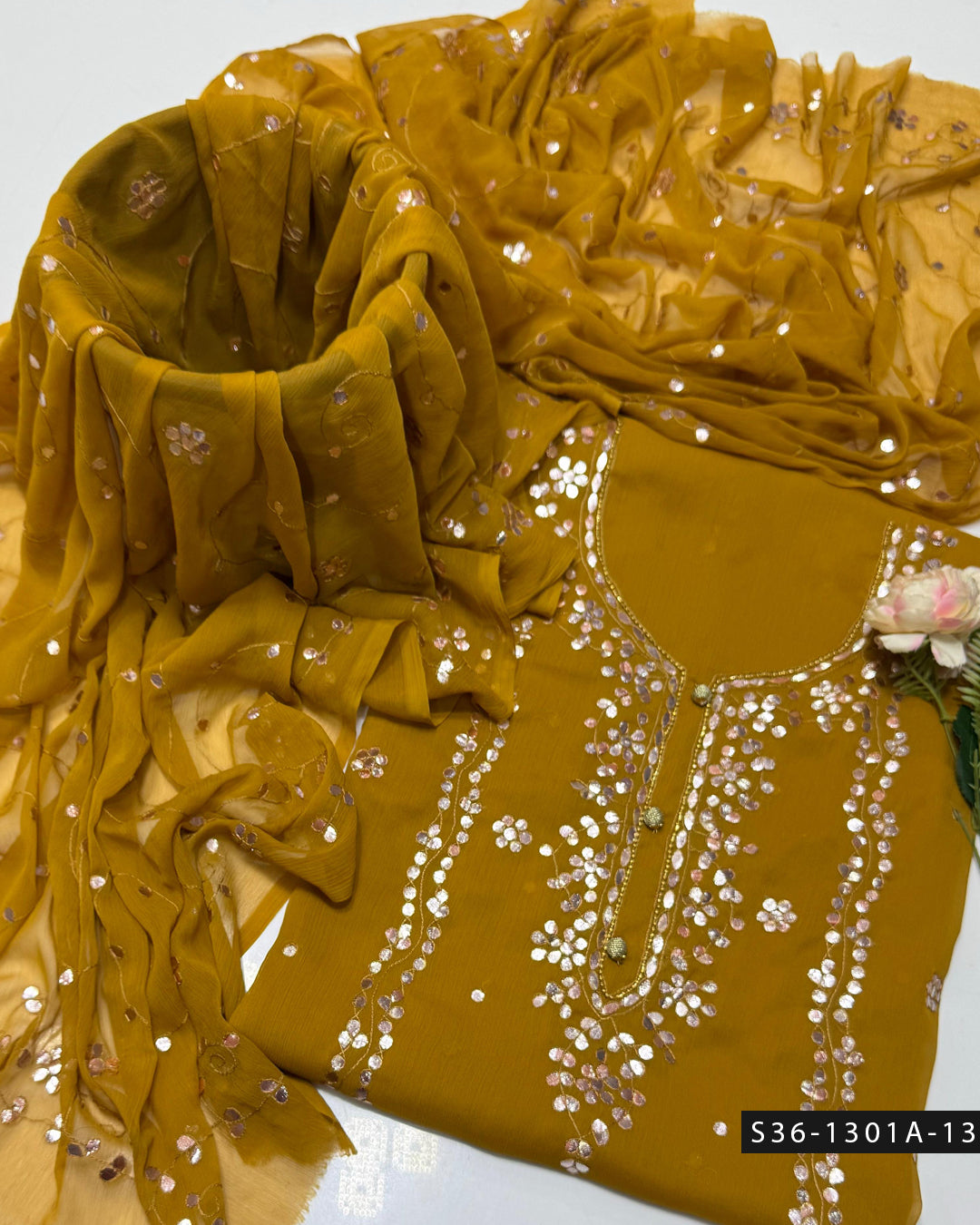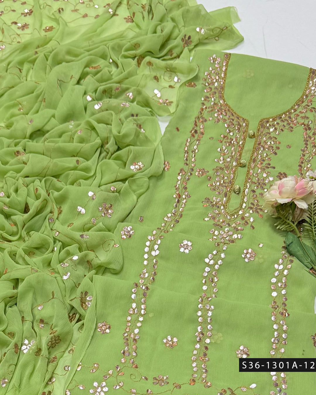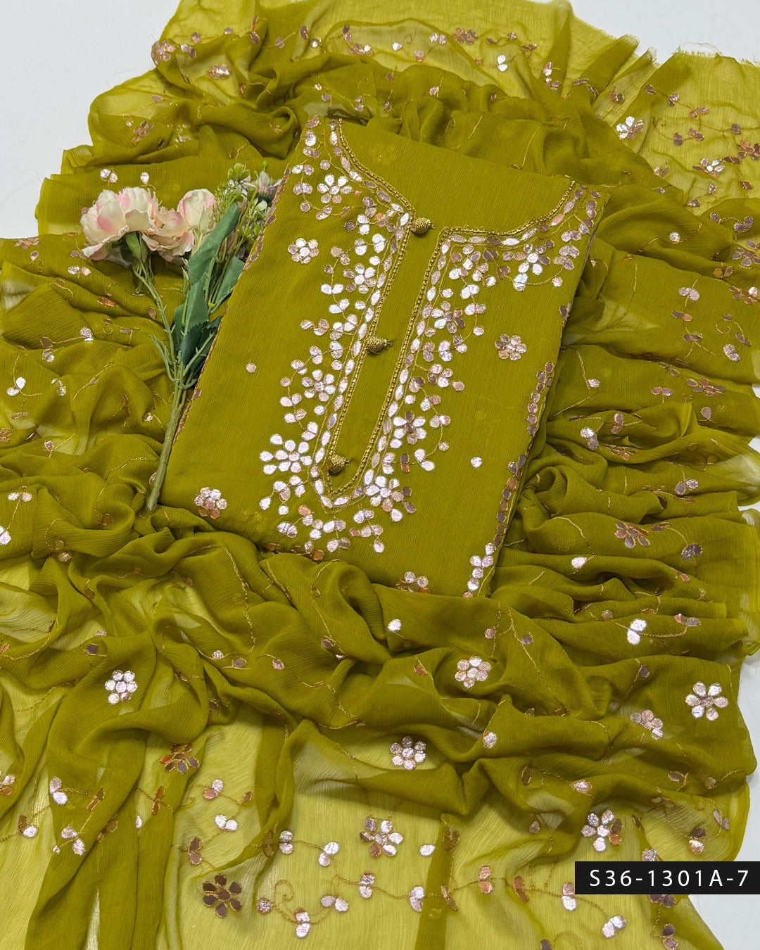 Fabric Detail:- Step up your style game with this handmade 2 PC unstitched crinkle chiffon suit, featuring delicate embroidery and luxurious hand-pressed gotta work + Bamber...
