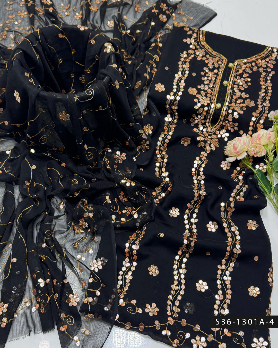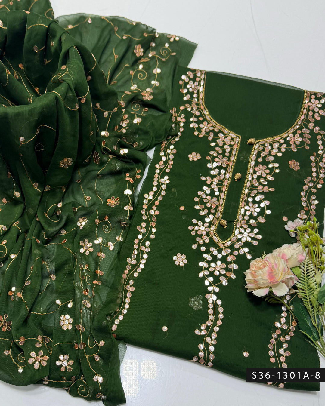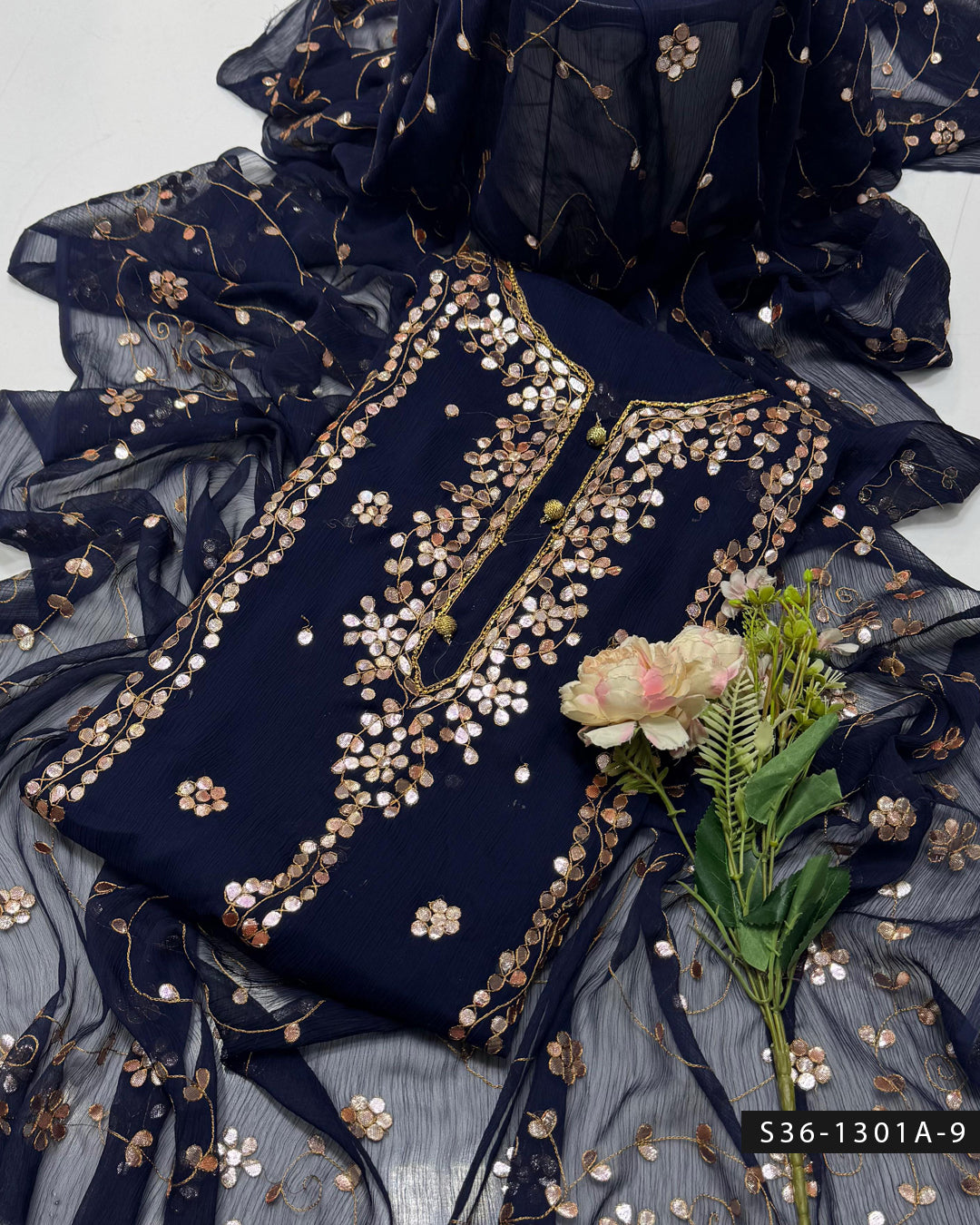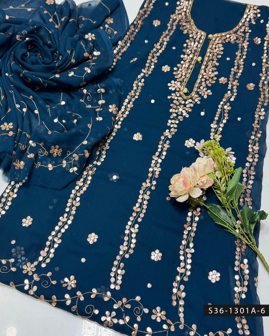 Fabric Detail:- Step up your style game with this handmade 2 PC unstitched crinkle chiffon suit, featuring delicate embroidery and luxurious hand-pressed gotta work + Bamber...
