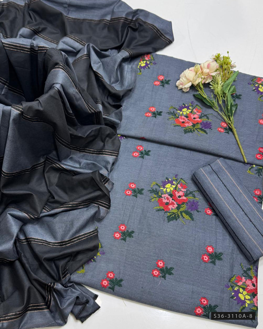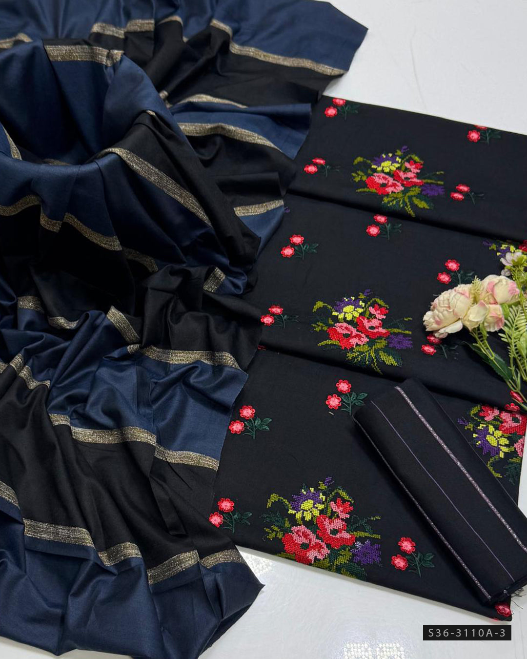 Fabric Detail:-Shirt Khaddi with Machine cross-stitch floral design + Velvet lining trouser + Velvet pata-style dupatta adding + Plain sleeves