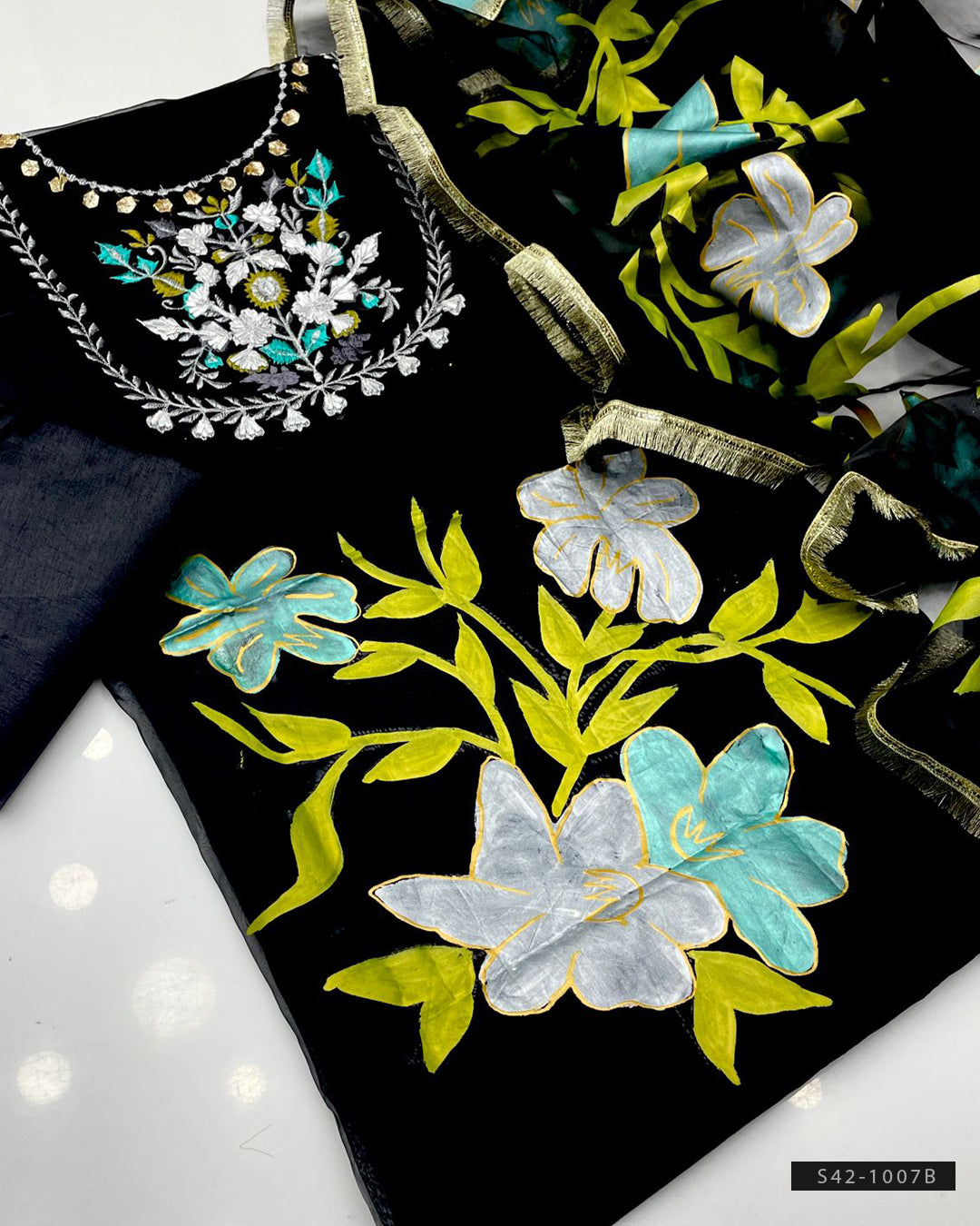 Fabric Detail:-Indian Organza shirt with Resham & Paint workOrganza dupatta with beautiful brush printPlain katan silk trouser – smooth & elegant
